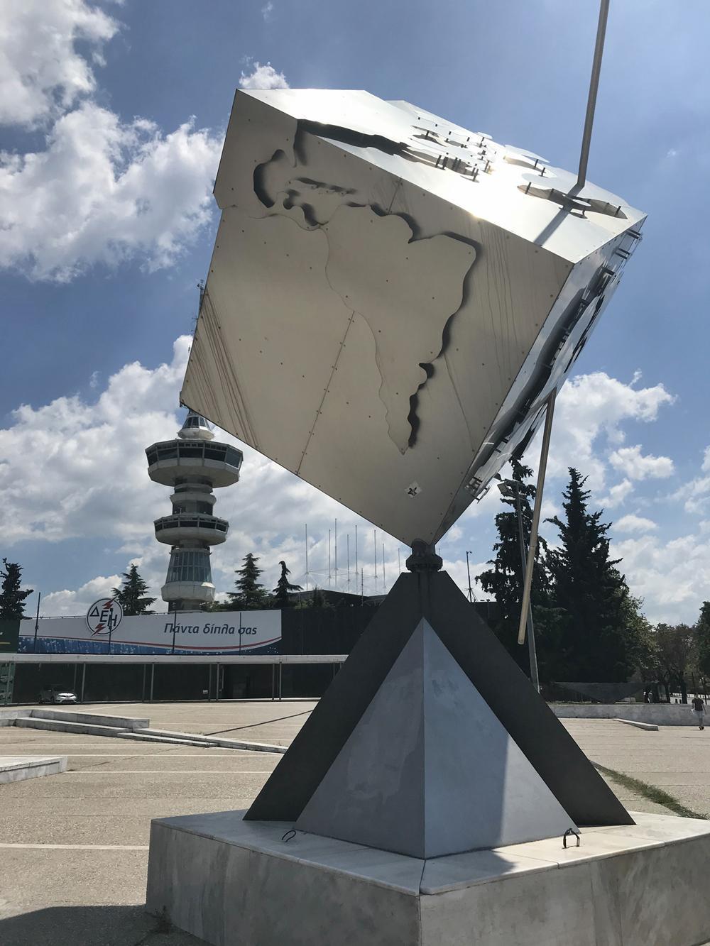Στη νότια είσοδο της ΔΕΘ, απέναντι από την ΧΑΝΘ, μπορεί κανείς να θαυμάσει το εντυπωσιακό γλυπτό ύψους 10 μέτρων του Παύλου Κουγιουμτζή με τίτλο «Ο Κόσμος της Καινοτομίας». Πρόκειται για έναν μεταλλικό κύβο πάνω στον οποίο είναι τοποθετημένος ανάγλυφα ο παγκόσμιος χάρτης. Τον κύβο διαπερνά διαγώνια μια μεταλλική ράβδος που καθορίζει το κέντρο και δίνει ισορροπία. Ο κύβος στηρίζεται στη μύτη μιας πυραμίδας. Το γλυπτό θέλει να τονίσει τον διεθνή χαρακτήρα της ΔΕΘ. Τοποθετήθηκε και παρέμεινε στο σημείο που βρίσκεται και σήμερα, κατά την 71η διοργάνωση της Διεθνούς Έκθεσης το 2006, χρονιά που ήταν αφιερωμένη στην «Καινοτομία», όπως ήταν και ο γενικότερος τίτλος της αλλά και ο τίτλος του γλυπτού.