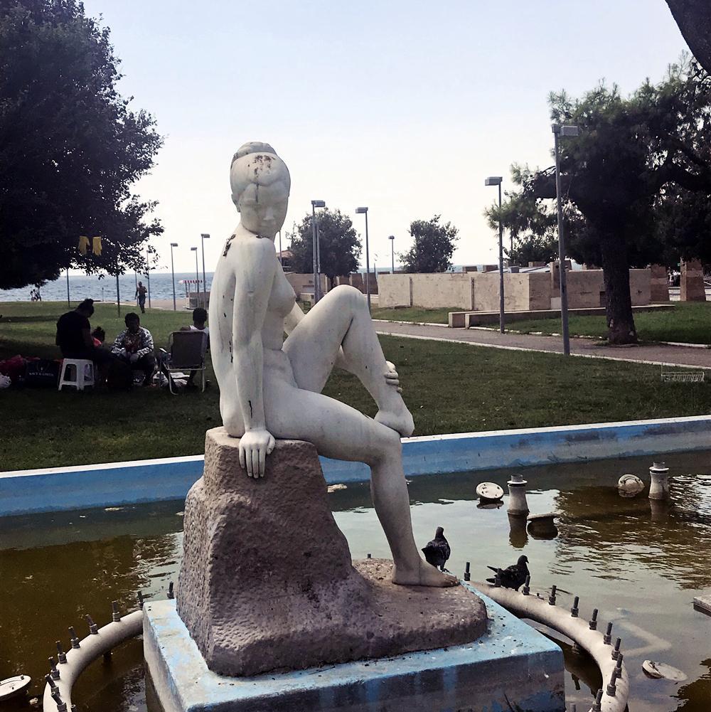 Μια νεαρή κοπέλα που κάθεται γυμνή πάνω σε ένα βράχο. Τα μαλλιά της είναι πιασμένα σε κότσο. Με το ένα χέρι ακουμπάει στο βράχο και με το άλλο πιάνει το ένα της πόδι σαν να το στηρίζει ή να το τοποθετεί για να κάτσει σταυρωτά. Κοιτάζει με το βλέμμα χαμηλωμένο προς το νερό, σε μια κίνηση σεμνότητας ή και ναρκισσισμού. Η κίνησή της, το χρώμα του μαρμάρου, η έκφραση, δένουν αρμονικά με τα νερά που τρέχουν γύρω της και το φυσικό τοπίο της παλιάς παραλίας. Ιδιαίτερα αγαπητό και πολυφωτογραφημένο γλυπτό, που παρά το ότι είναι πόλος έλξης, τα φώτα που το αναδεικνύουν τις βραδινές ώρες, καθώς και τα νερά του σιντριβανιού, δεν βρίσκονται συνέχεια σε λειτουργία.