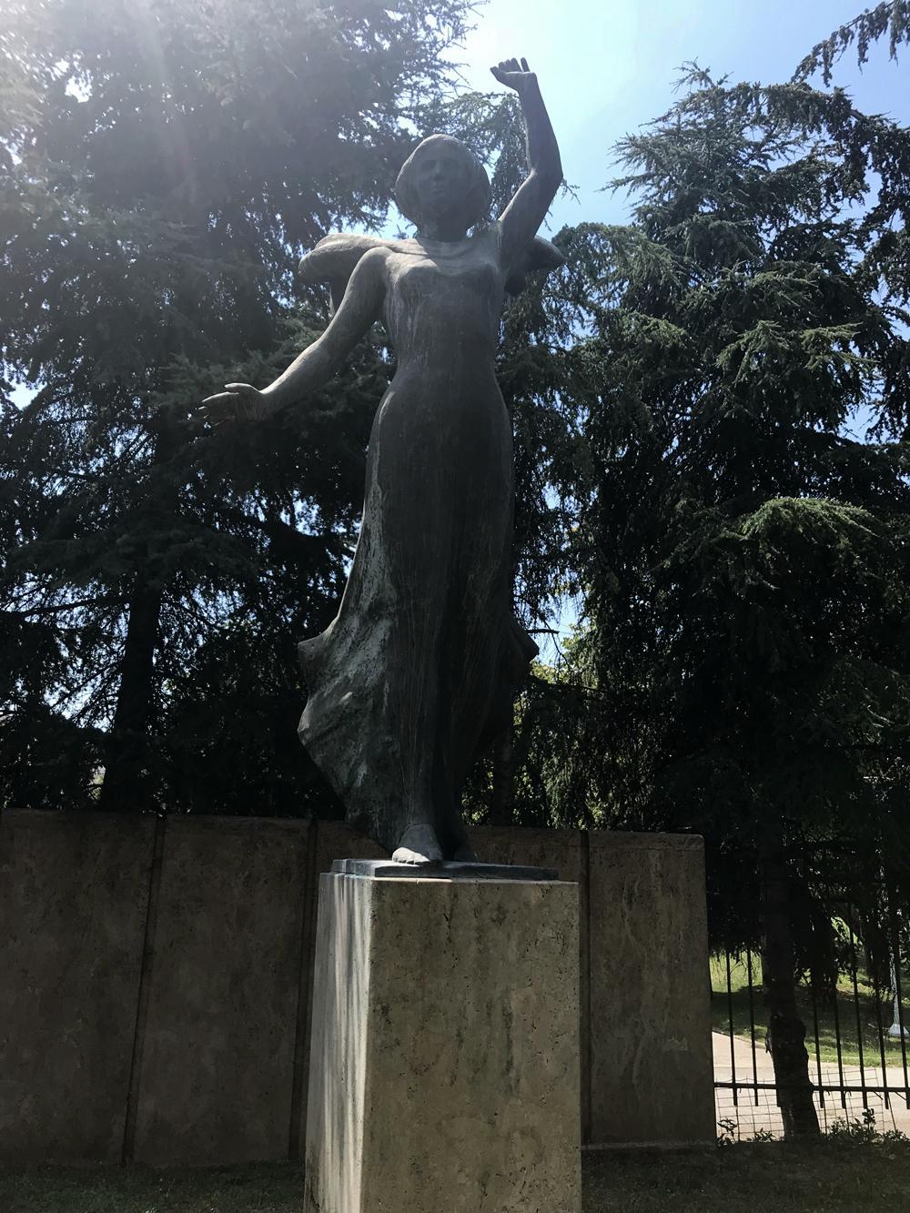 Στο γλυπτό αυτό βλέπουμε μια γυναικεία μορφή, ένα ορειχάλκινο άγαλμα μεγάλων διαστάσεων πάνω σε ένα βάθρο. Τα χέρια είναι ανοιχτά και η γυναίκα κάνει ένα βήμα. Πιθανό είναι η ελευθερία, η νίκη που κάνει το αποφασιστικό βήμα προς τα μπροστά δίχως φόβο. Πίσω ακριβώς από το άγαλμα, υπάρχει ένα τοιχίο στο οποίο αναπαρίσταται με ορείχαλκο και πάλι το σήμα της Ελληνικής Χωροφυλακής.