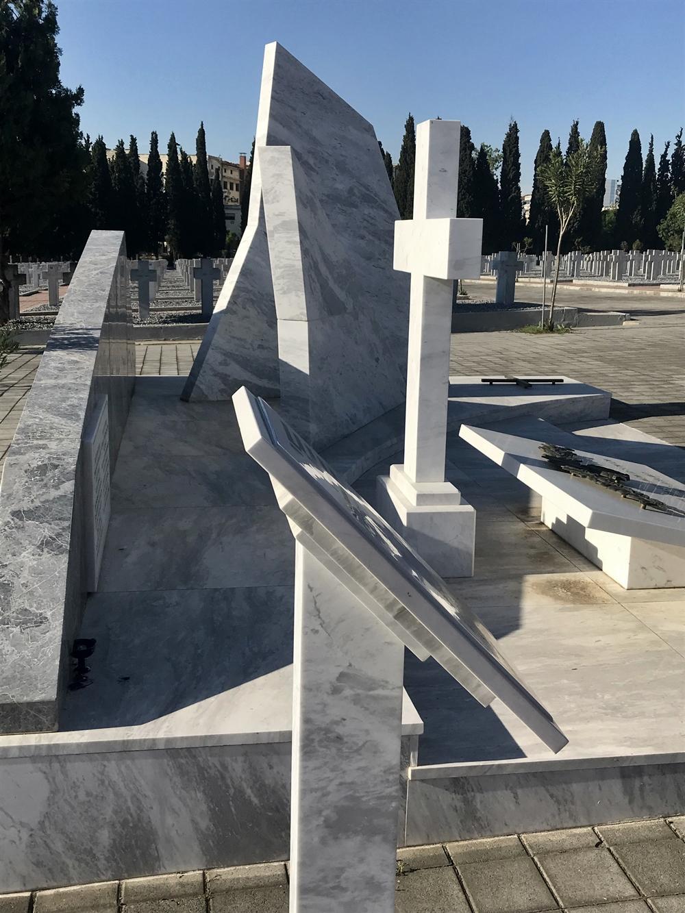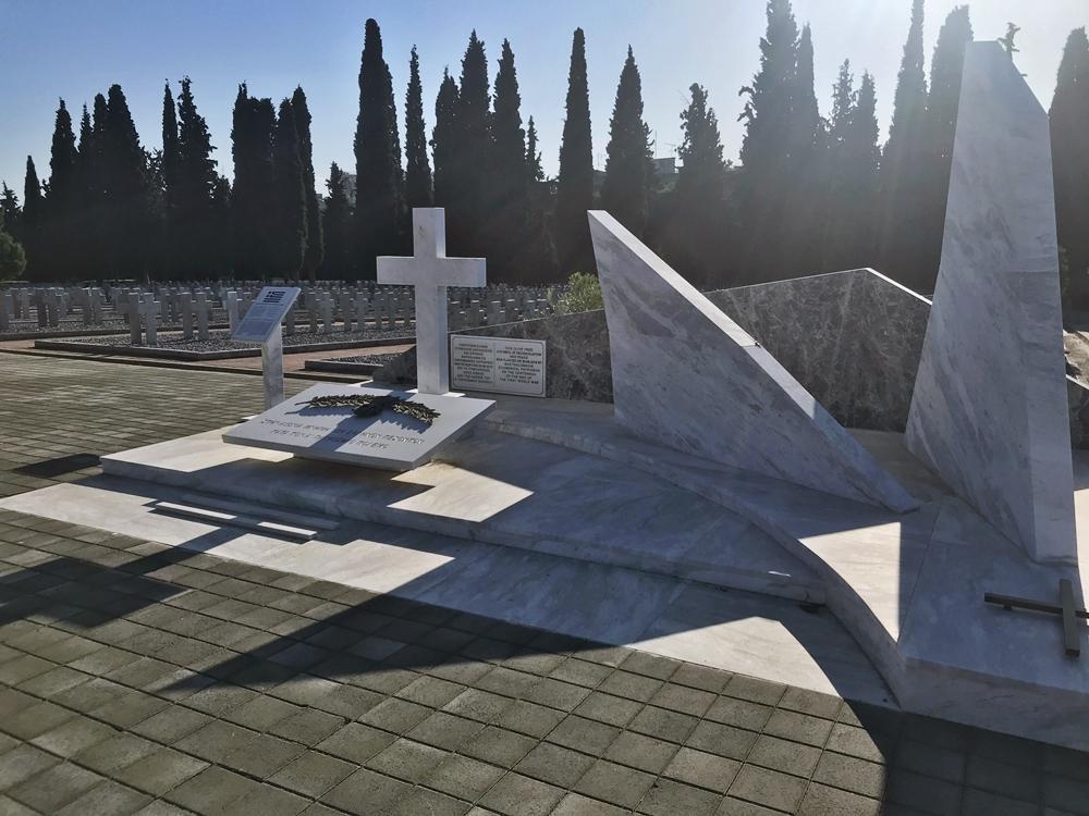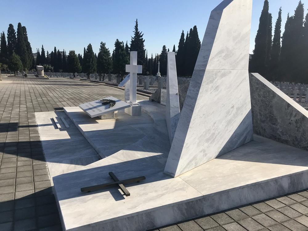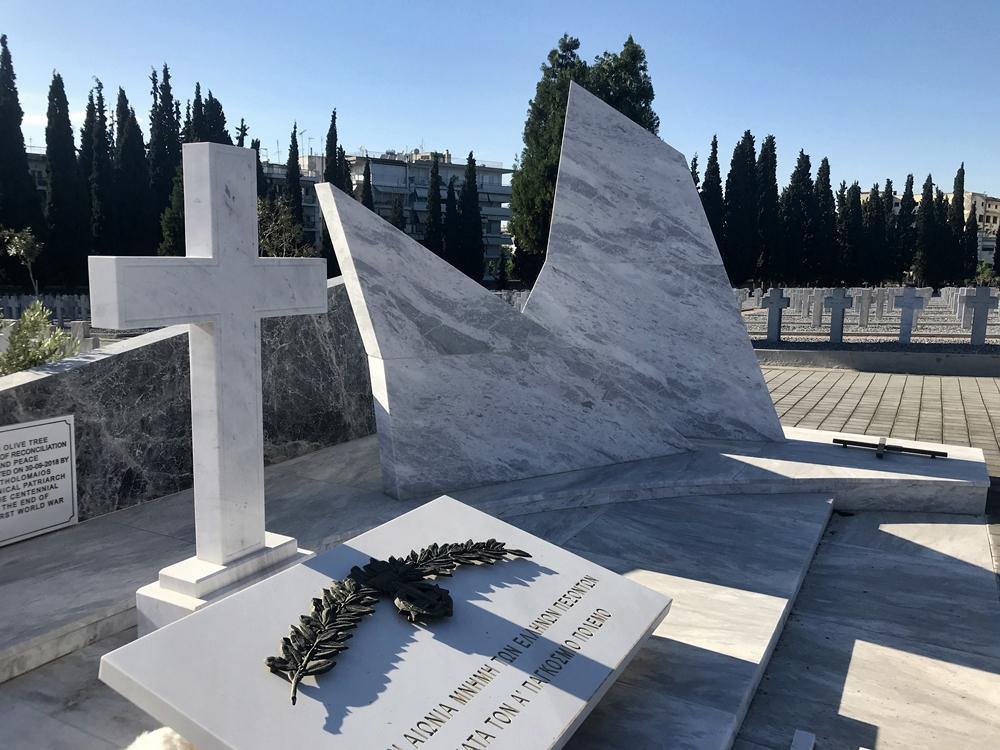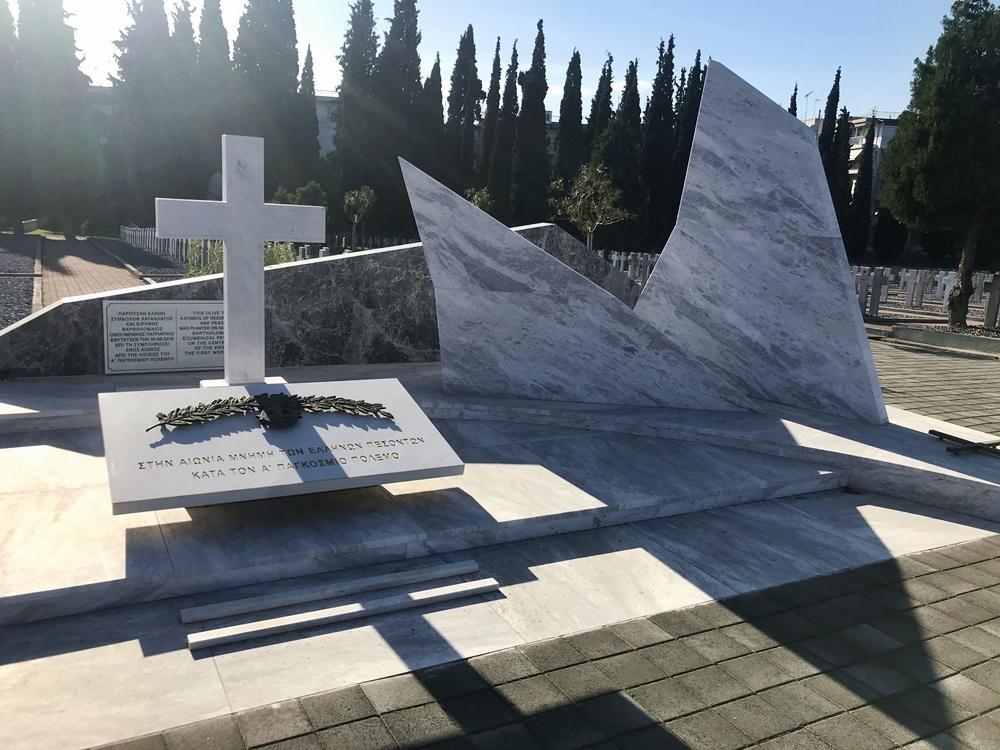 Πρόκειται για μια σύνθεση από μάρμαρο, τοποθετημένη στον Γαλλικό τομέα δίπλα από την κόκκινη εκκλησία, που παραπέμπει με συμβολισμούς στην εποχή και τα γεγονότα του πρώτου μεγάλου πολέμου. Το σκούρο μάρμαρο που αποτελεί την πίσω πλευρά του μνημείου, συμβολίζει την γραμμή του Μακεδονικού μετώπου, ενώ οι δύο κάθετες λευκές μαρμάρινες πλάκες αναφέρονται στην προσπάθεια των Ελληνικών δυνάμεων της Αντάντ να διασπάσουν το μέτωπο. Οι μαρμάρινες λευκές επιφάνειες έχουν σχήμα φτερών, σαν ένα περιστέρι αφηρημένης μορφής και προσέγγισης, που συμβολίζει την νίκη, την αγνότητα και την ειρήνη. Στο κέντρο του μνημείου δεσπόζει ένας μαρμάρινος σταυρός και μια αφιέρωση «Στην αιωνία μνήμη των Ελλήνων πεσόντων κατά τον Α’ Παγκόσμιο Πόλεμο». Στα δεξιά, παρουσιάζεται ο Πολεμικός σταυρός του Α’ Παγκοσμίου Πολέμου από ορείχαλκο. Το μνημείο κατασκευάστηκε με μέριμνα της 737 Διεύθυνσης στρατιωτικών έργων του Γ’ Σώματος Στρατού του Γενικού Επιτελείου Στρατού και τα αποκαλυπτήριά του έγιναν στις 30 Σεπτεμβρίου του 2017. Στις 30.09.2018, επέτειο συμπλήρωσης ενός αιώνα από την λήξη του πολέμου, ο πατριάρχης Βαρθολομαίος φύτεψε μια ελιά, σύμβολο της ειρήνης και ομόνοιας, στο πίσω μέρος του μνημείου.