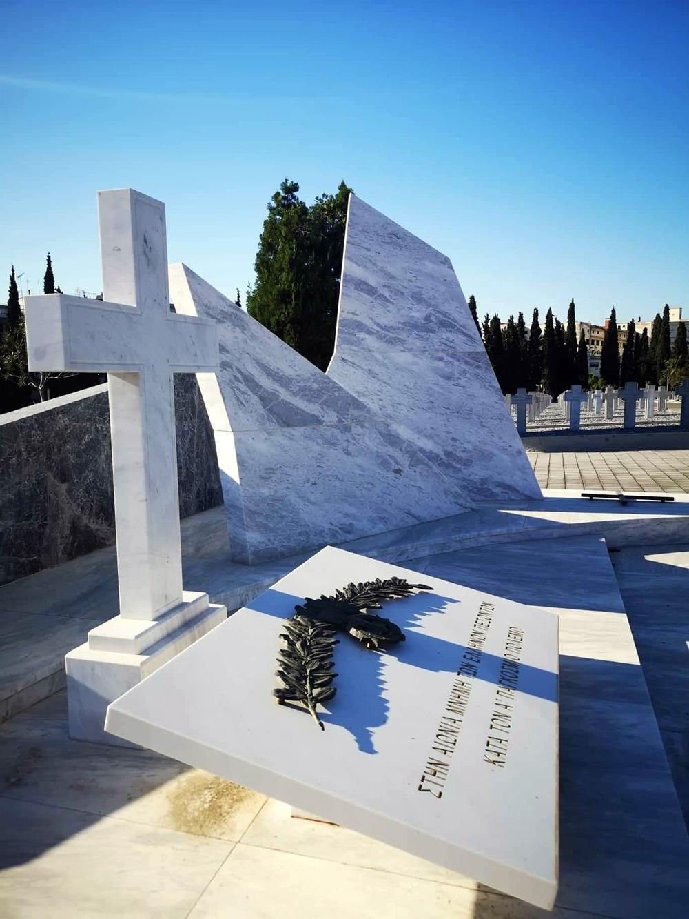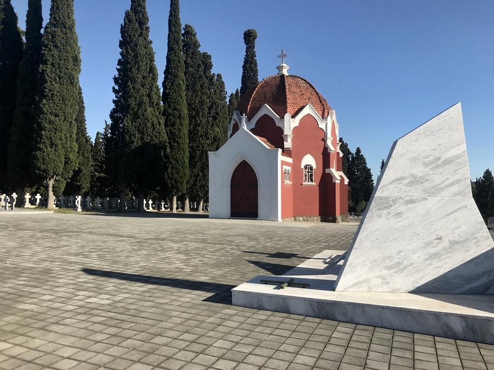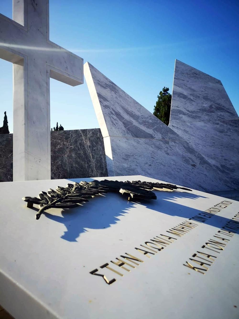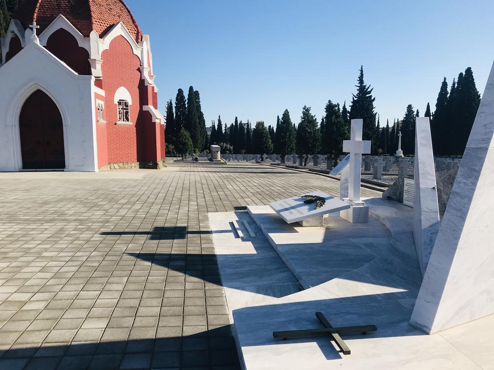 Πρόκειται για μια σύνθεση από μάρμαρο, τοποθετημένη στον Γαλλικό τομέα δίπλα από την κόκκινη εκκλησία, που παραπέμπει με συμβολισμούς στην εποχή και τα γεγονότα του πρώτου μεγάλου πολέμου. Το σκούρο μάρμαρο που αποτελεί την πίσω πλευρά του μνημείου, συμβολίζει την γραμμή του Μακεδονικού μετώπου, ενώ οι δύο κάθετες λευκές μαρμάρινες πλάκες αναφέρονται στην προσπάθεια των Ελληνικών δυνάμεων της Αντάντ να διασπάσουν το μέτωπο. Οι μαρμάρινες λευκές επιφάνειες έχουν σχήμα φτερών, σαν ένα περιστέρι αφηρημένης μορφής και προσέγγισης, που συμβολίζει την νίκη, την αγνότητα και την ειρήνη. Στο κέντρο του μνημείου δεσπόζει ένας μαρμάρινος σταυρός και μια αφιέρωση «Στην αιωνία μνήμη των Ελλήνων πεσόντων κατά τον Α’ Παγκόσμιο Πόλεμο». Στα δεξιά, παρουσιάζεται ο Πολεμικός σταυρός του Α’ Παγκοσμίου Πολέμου από ορείχαλκο. Το μνημείο κατασκευάστηκε με μέριμνα της 737 Διεύθυνσης στρατιωτικών έργων του Γ’ Σώματος Στρατού του Γενικού Επιτελείου Στρατού και τα αποκαλυπτήριά του έγιναν στις 30 Σεπτεμβρίου του 2017. Στις 30.09.2018, επέτειο συμπλήρωσης ενός αιώνα από την λήξη του πολέμου, ο πατριάρχης Βαρθολομαίος φύτεψε μια ελιά, σύμβολο της ειρήνης και ομόνοιας, στο πίσω μέρος του μνημείου.