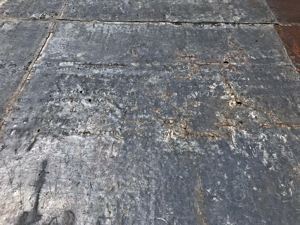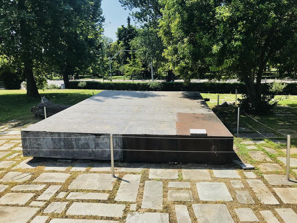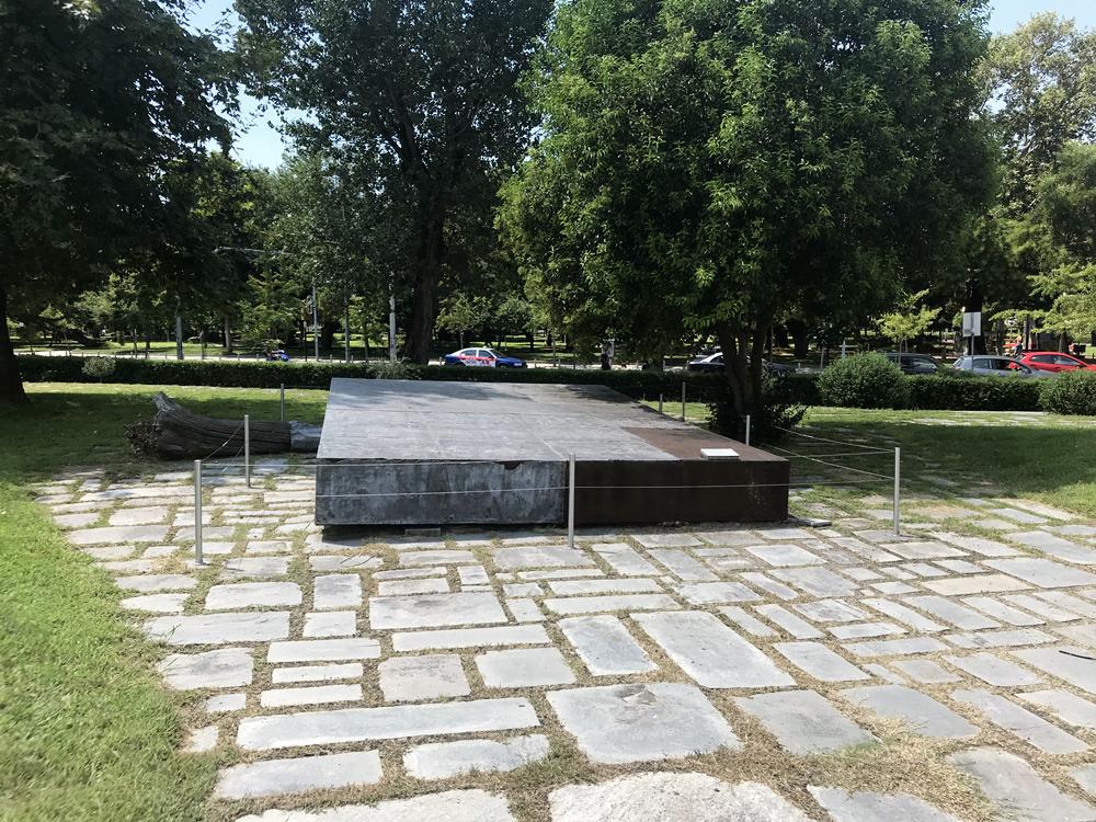 Ένας κορμός δέντρου βρίσκεται πεσμένος ανάμεσα στα άλλα δέντρα και το γκαζόν της αυλής του μουσείου. Τον κορμό σκεπάζει, σαν να τον πλακώνει, μια τσιμεντένια πλάκα. Πάνω στην πλάκα, επενδυμένη με μολύβι, μπορεί κανείς να διακρίνει στίχους από την «Αποκάλυψη» του Ιωάννη. Φιλοτεχνήθηκε από τον Κώστα Τσόκλη το 1988 και είναι αφιερωμένο στον Αλέξανδρο Ιόλα. Ανήκει στην συλλογή του Μακεδονικού Μουσείου Σύγχρονης τέχνης και είναι δωρεά της εταιρείας Ι. Μπουτάρης και Υιός.