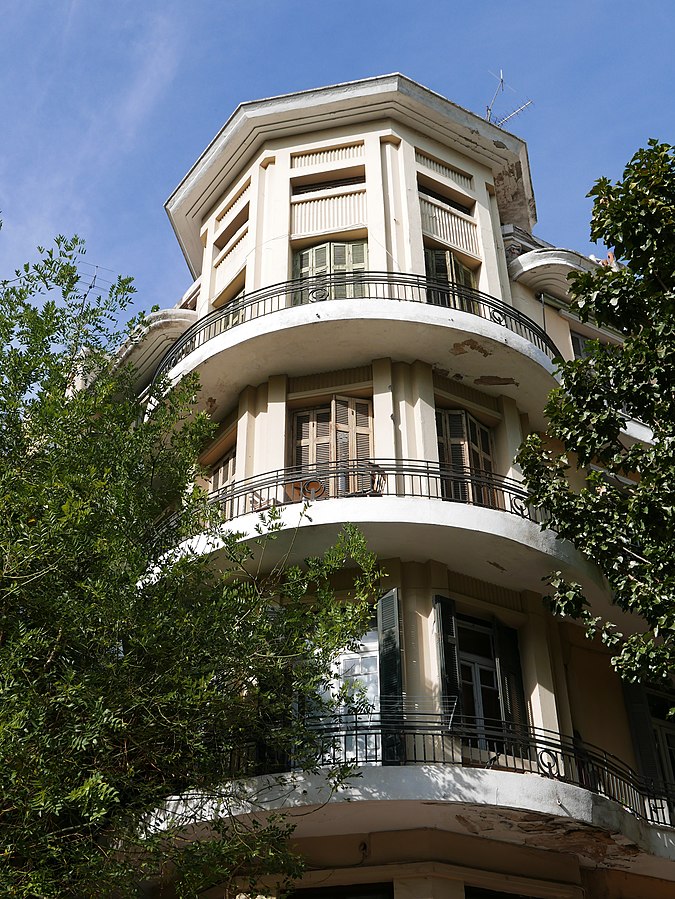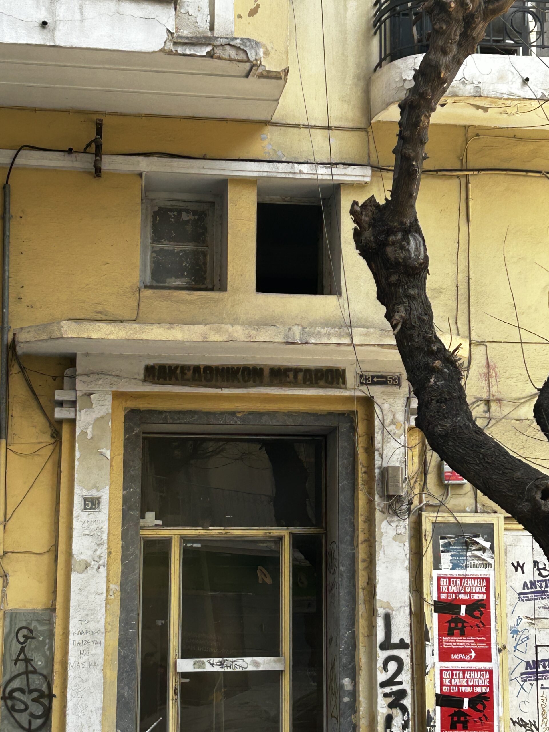 Σε έναν δρόμο με πολλά νεοκλασικά κτήρια το Μακεδονικό Μέγαρο ξεχωρίζει για το χρώμα και τις Art Deco καμπύλες του