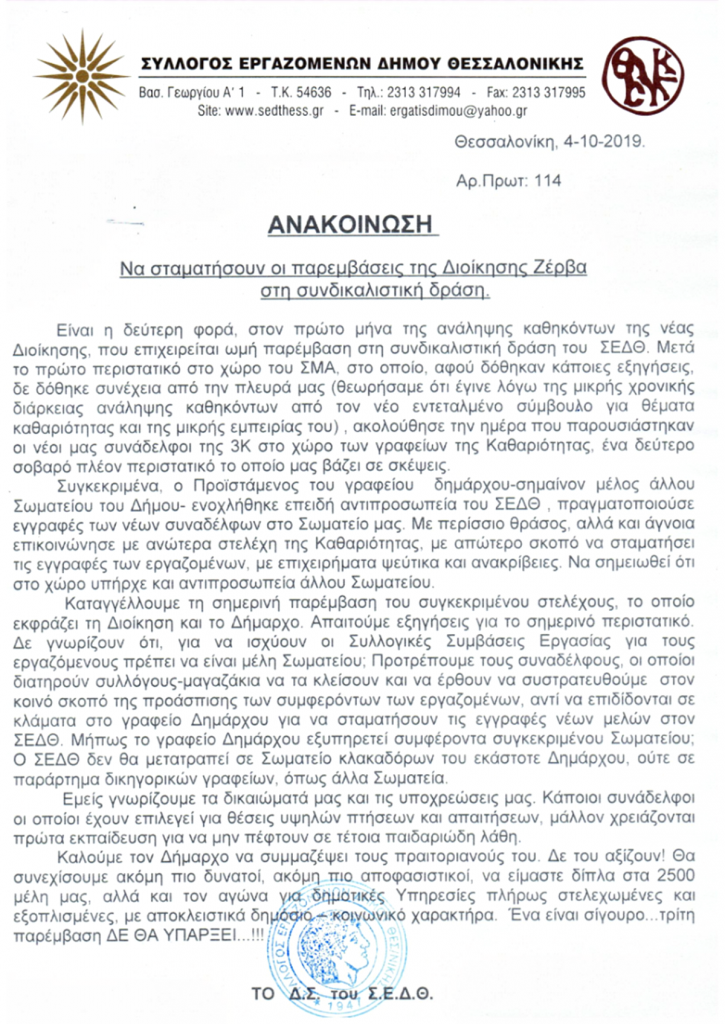 Το πρόσφατο περιστατικό που αναφέρουν στην ανακοίνωσή τους αφορά τον Προϊστάμενο του γραφείου δημάρχου ο οποίος όπως αναγράφεται στην ανακοίνωση “ενοχλήθηκε επειδή αντιπροσωπεία του ΣΕΔΘ πραγματοποιούσε εγγραφές των νέων συναδέλφων στο Σωματείο” και πως με “περίσσιο θράσος (σσ ο προϊστάμενος) αλλά και άγνοια επικοινώνησε με ανώτερα στελέχη της Καθαριότητας, με απώτερο σκοπό να σταματήσει τις εγγραφές των εργαζομένων, με επιχειρήματα ψεύτικα και ανακρίβειες.”