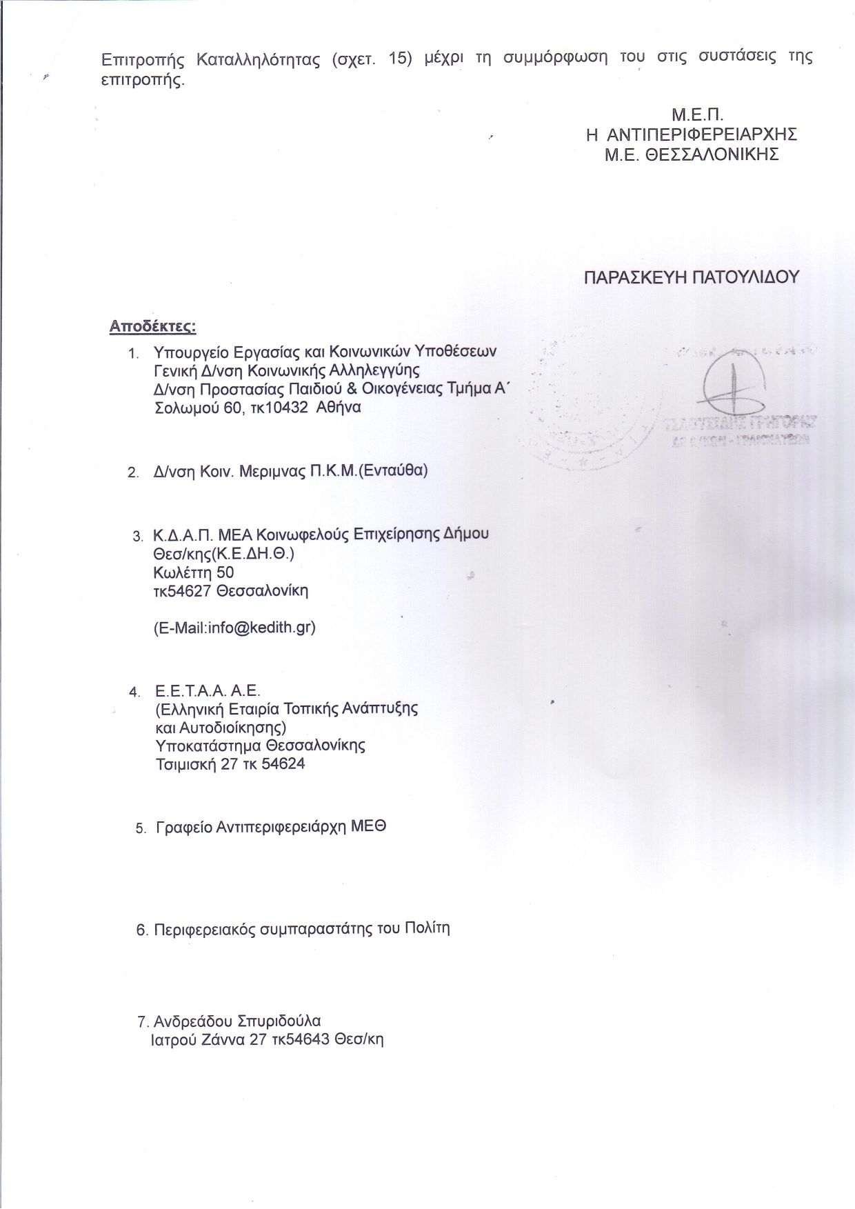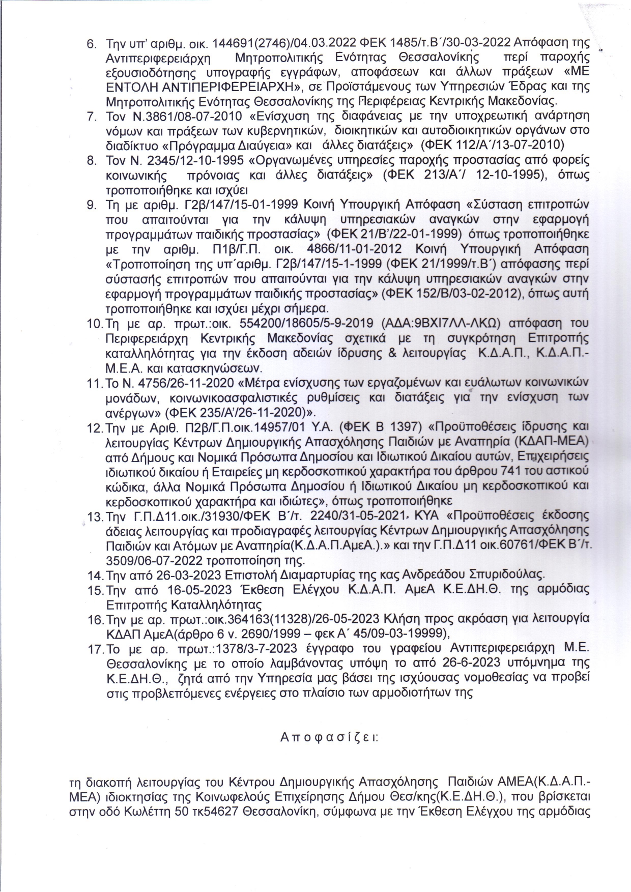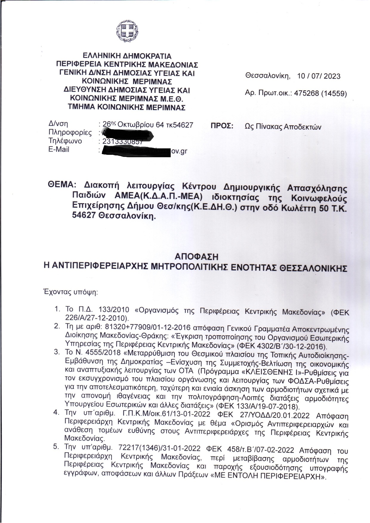 Με απόφαση της αντιπεριφερειάρχη Μητροπολιτικής Ενότητας Θεσσαλονίκης Βούλας Πατουλίδου, αναστέλλεται η λειτουργία του ΚΔΑΠ ΜΕΑ του δήμου Θεσσαλονίκης, που βρίσκεται στην οδό Κωλέττη, διότι έχει κριθεί ακατάλληλο και δεν πληροί τις προϋποθέσεις που ορίζει ο νόμος.