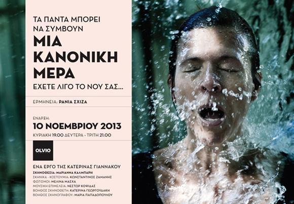Μια γυναίκα. Ελληνίδα. Νοικοκυρά. Μητέρα δύο κοριτσιών. Στο Euro 2004 δακρύζει από συγκίνηση στο μπαλκόνι της ακούγοντας τα κορναρίσματα στη Μεσογείων. Ούτε δέκα χρόνια μετά, μια κανονική μέρα η δική της κανονική ζωη διακόπτεται βίαια. Εκείνος, ο Σύζυγος, ο Πατέρας, ο Άντρας αυτοκτονεί λόγω χρεών. Κι Εκείνη μένει πίσω, μόνη με τα κορίτσια της να αντιμετωπίσει το γιατί, το θυμό, την ενοχή, το στίγμα, τα χρέη. Και κάπως έτσι, έστω και αργά, μαθαίνει να παλεύει για την κάθε μέρα, ζώντας όχι με εκείνα που έχασε αλλά με εκείνα που κάθε μέρα βρίσκει. Στο έργο της Κατερίνας Γιαννάκου, «Μια κανονική μέρα», η Ράνια Σχίζα πορεύεται επί σκηνής υπό τις σκηνοθετικές οδηγίες της Μαριάννας Κάλμπαρη το δύσκολο δρόμο προς την επόμενη μέρα, ερμηνεύοντας αυτό τον οδυνηρά επίκαιρο αλλά και αναπάντεχα λυτρωτικό μονόλογο για τη μάχη του σύγχρονου ανθρώπου με τα σημεία και τα τέρατα των καιρών.