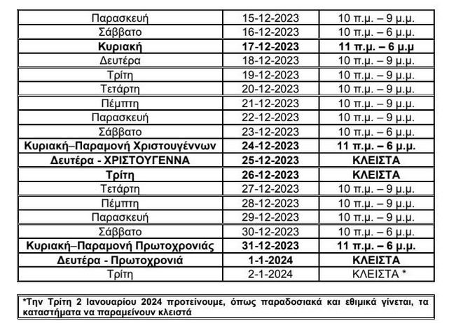 Σύμφωνα με ανακοίνωση του Εμπορικού Συλλόγου Θεσσαλονίκης, η αγορά της πόλης θα είναι ανοιχτή τις Κυριακές 17, 24 και 31 Δεκεμβρίου από τις 11.00 το πρωί μέχρι τις 18.00 το απόγευμα.