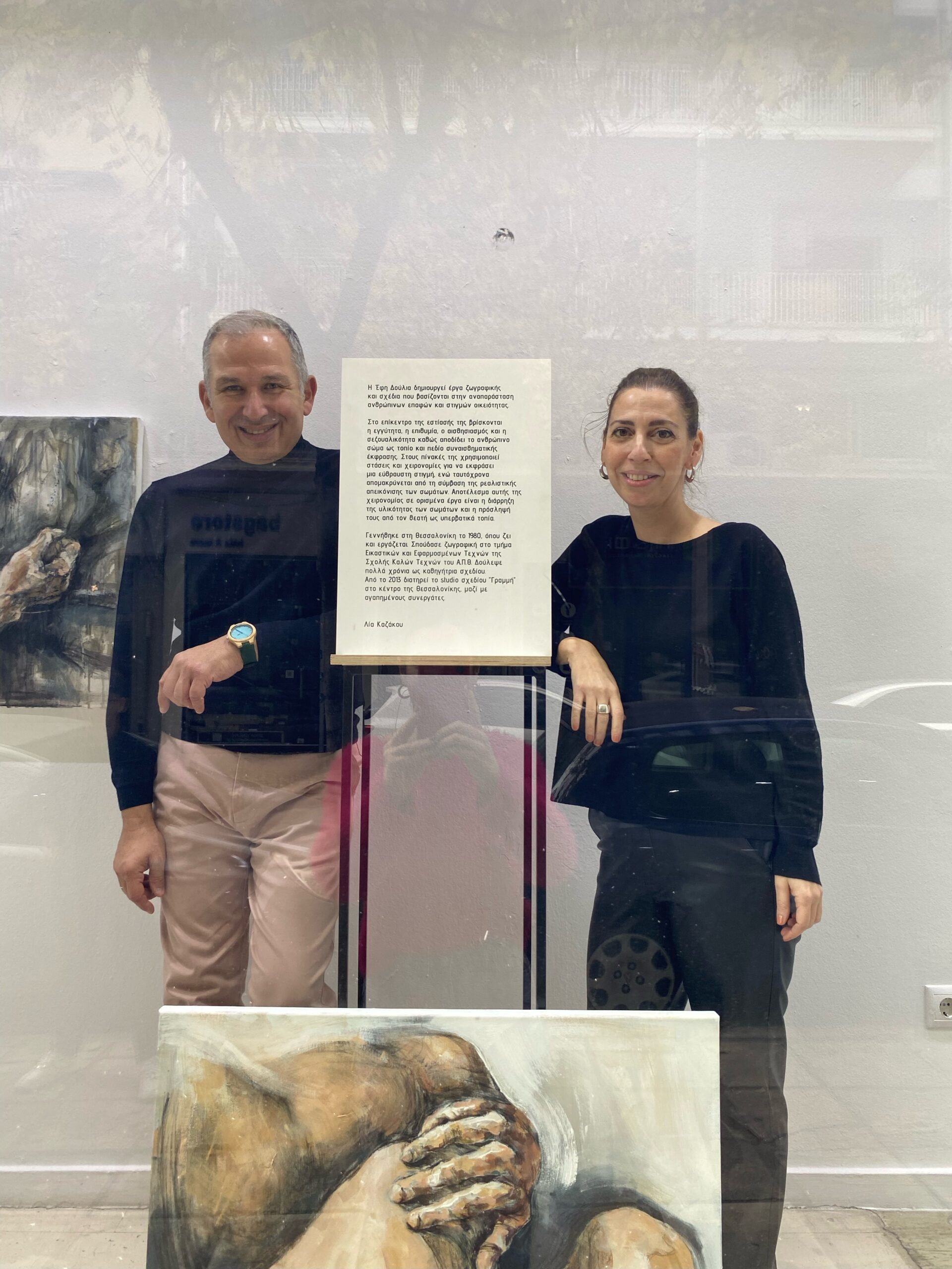 Η Έφη Δούλια δημιουργεί έργα ζωγραφικής και σχέδια που βασίζονται στην αναπαράσταση ανθρώπινων επαφών και στιγμών οικειότητας.
