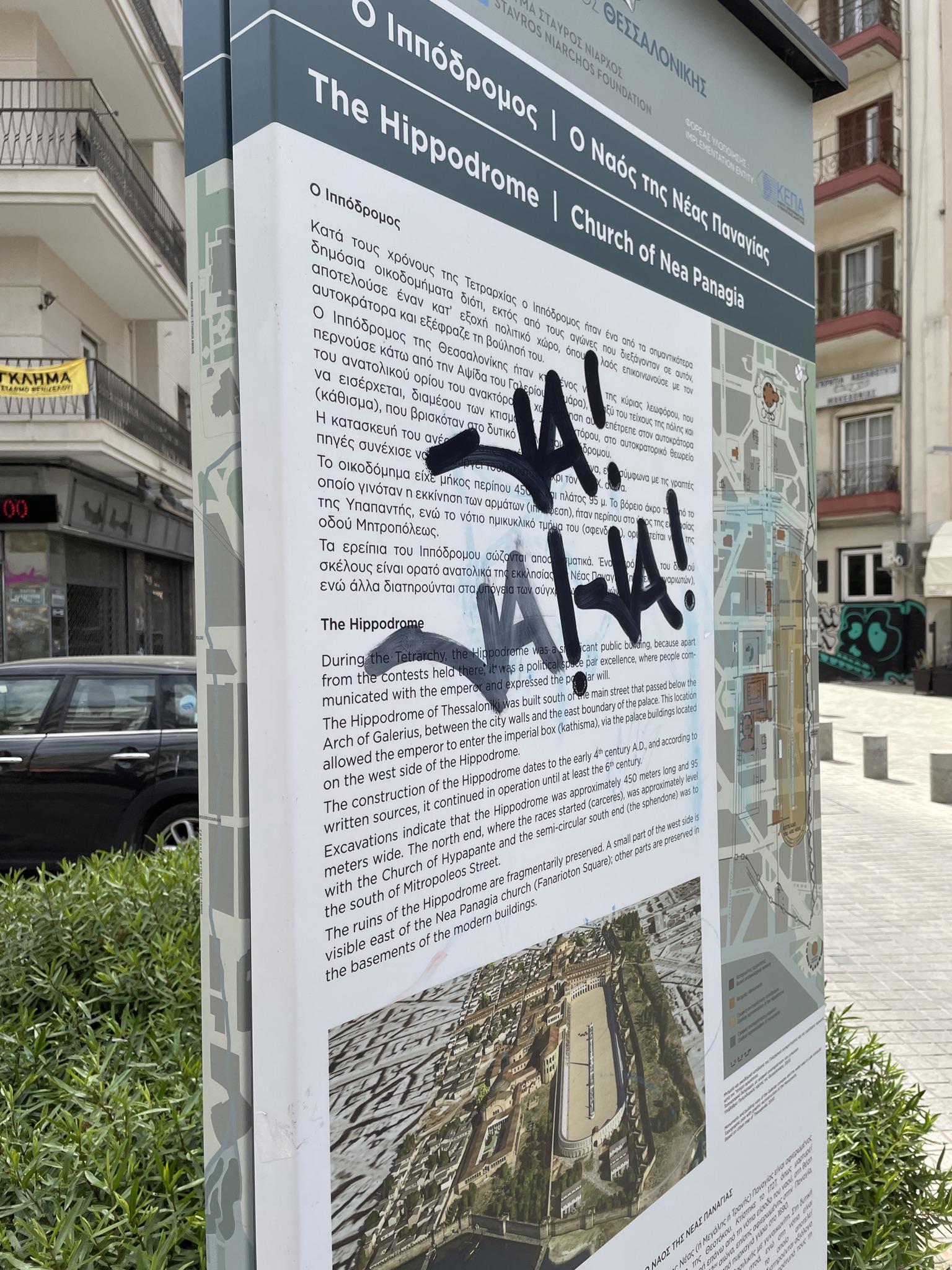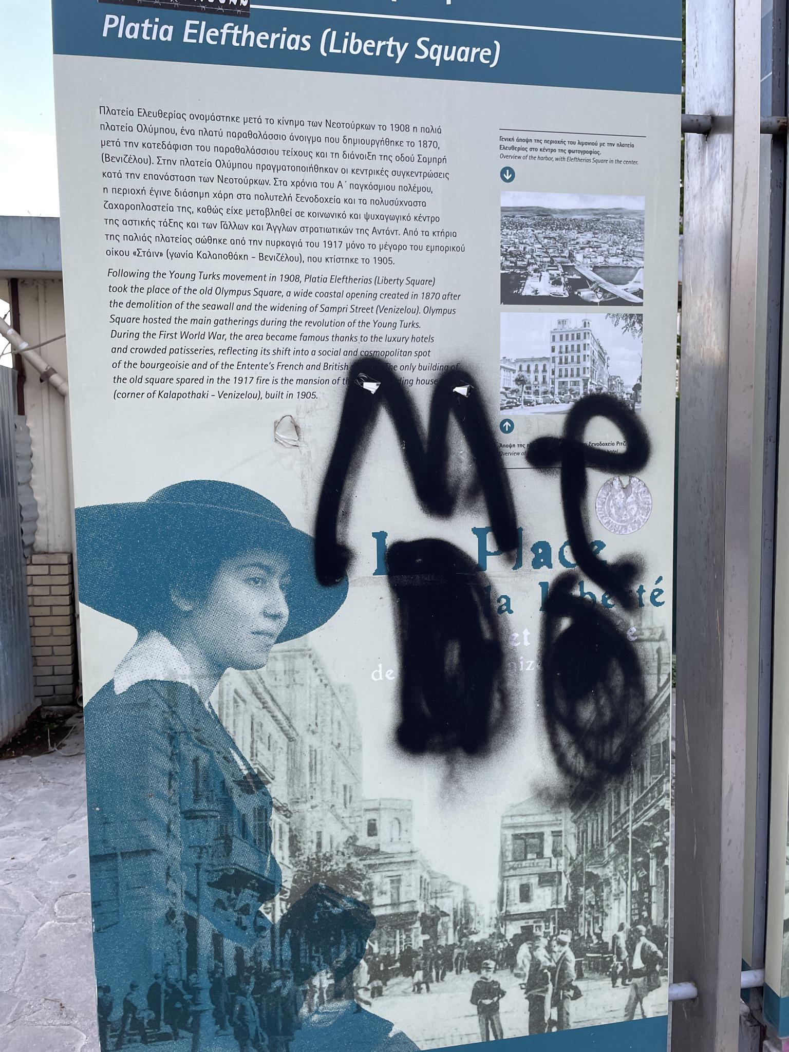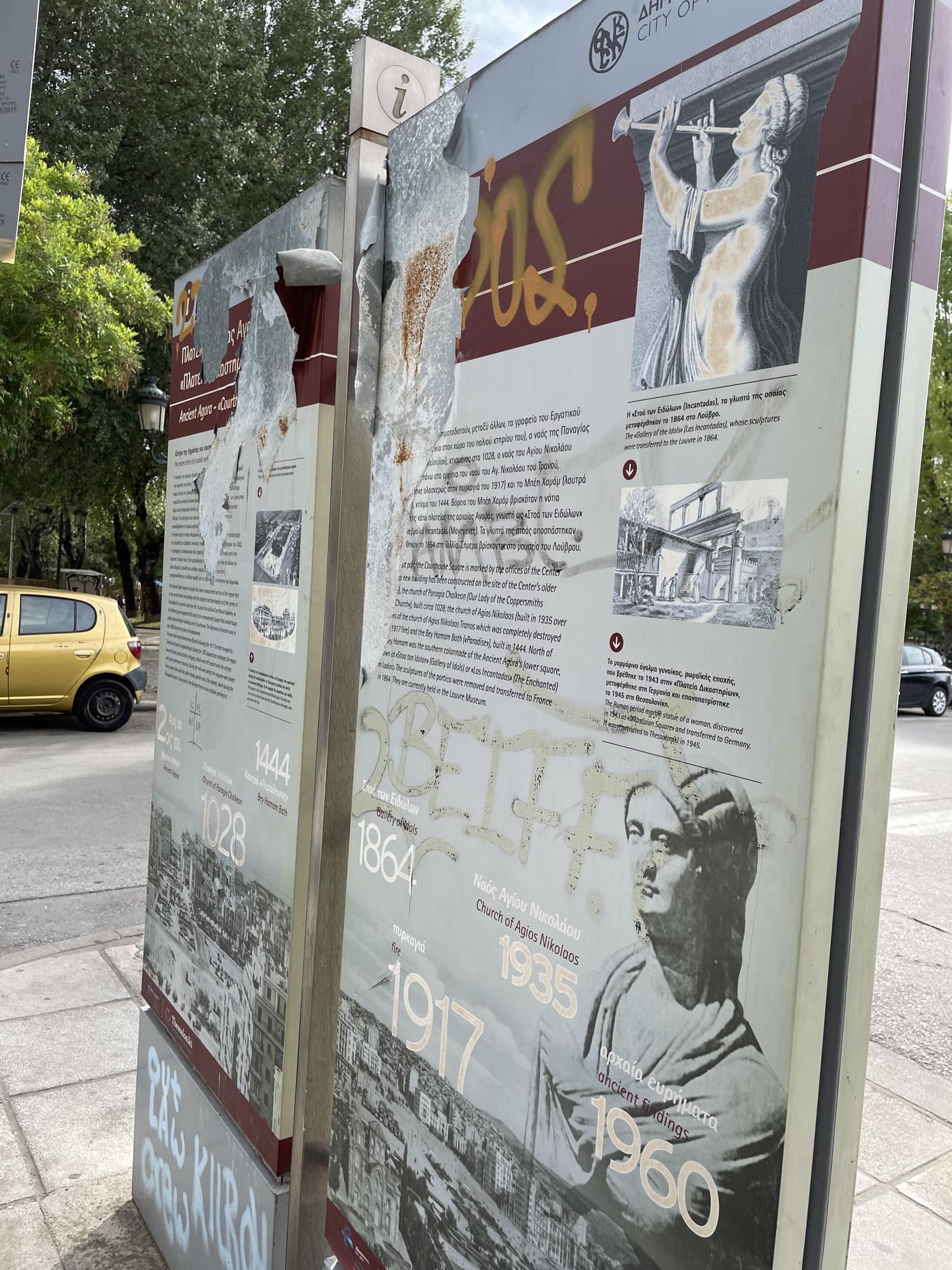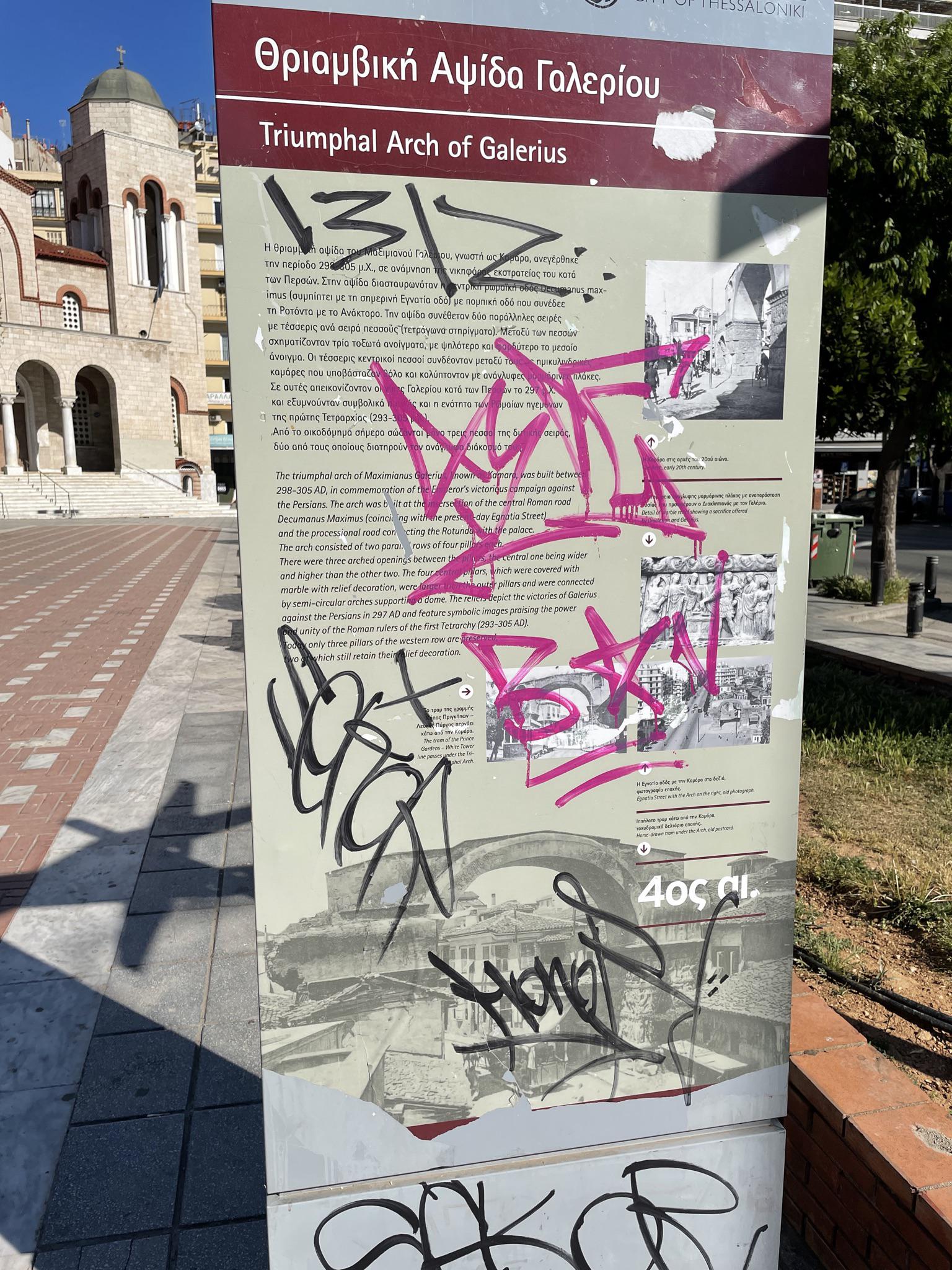 Θα ήταν περίεργο όμως σε μια πόλη που ο βανδαλισμός είναι η χρόνια επιδημία της, αρκετά από αυτά να μην είχαν καταλήξει μια σιδερένια μάζα από μουντζούρες δίπλα σε ένα σημαντικό μνημείο υποβαθμίζοντας το μνημείο και στερώντας ουσιαστικά τους επισκέπτες από την πληροφορία.