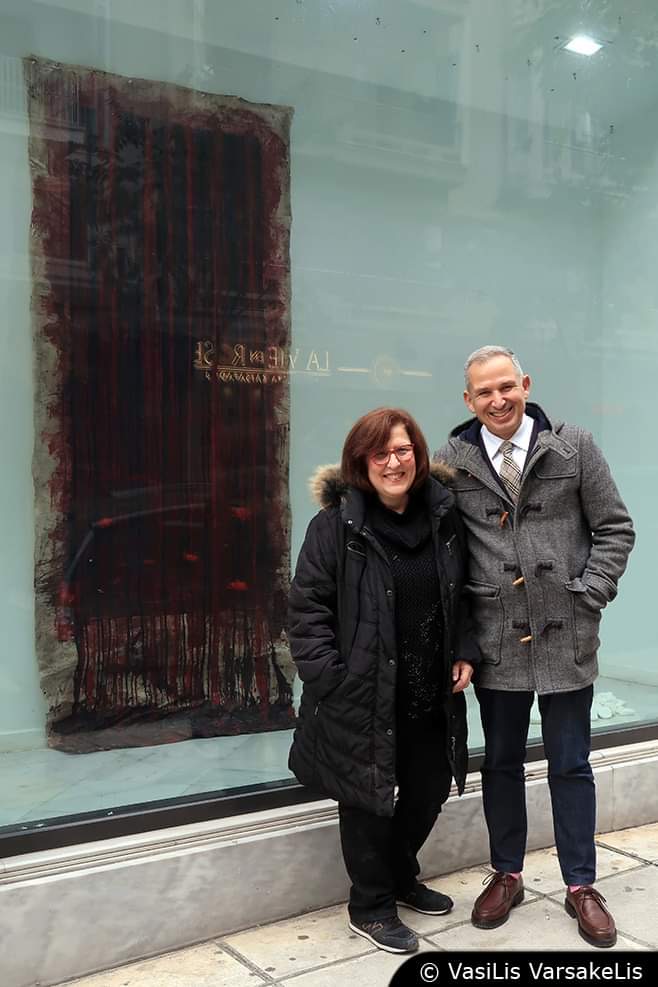Ροές κόκκινου, μαύρου και καφέ χρώματος, που η εικαστικός έριξε από ψηλά για να κυλήσουν προς το έδαφος, επιδέχονται πολλαπλές ερμηνείες: αίμα, βία, πόνος, θάνατος, πόλεμος, απόγνωση είναι μερικές που ανακαλούνται ενστικτωδώς. Σε ορισμένα σημεία το χρώμα πέφτει ατόφιο σαν φωτεινή πιτσιλιά και αφήνει κάποιο περιθώριο ελπίδας. Ο μουσαμάς, που επιβάλλεται με το μέγεθος και το χρώμα, έχει μετατραπεί σε πεδίο δράσης. Σε μικρή απόσταση, ένα ζεύγος πήλινων εκμαγείων χεριών ξεπροβάλλει από το έδαφος σε απόγνωση, σε αναζήτηση σωτηρίας. Η απώλεια στον πόλεμο, εξάλλου, όπως επισημαίνει η Καλτσίδου, συνδέεται με την απώλεια της εστίας, της πατρώας γης.