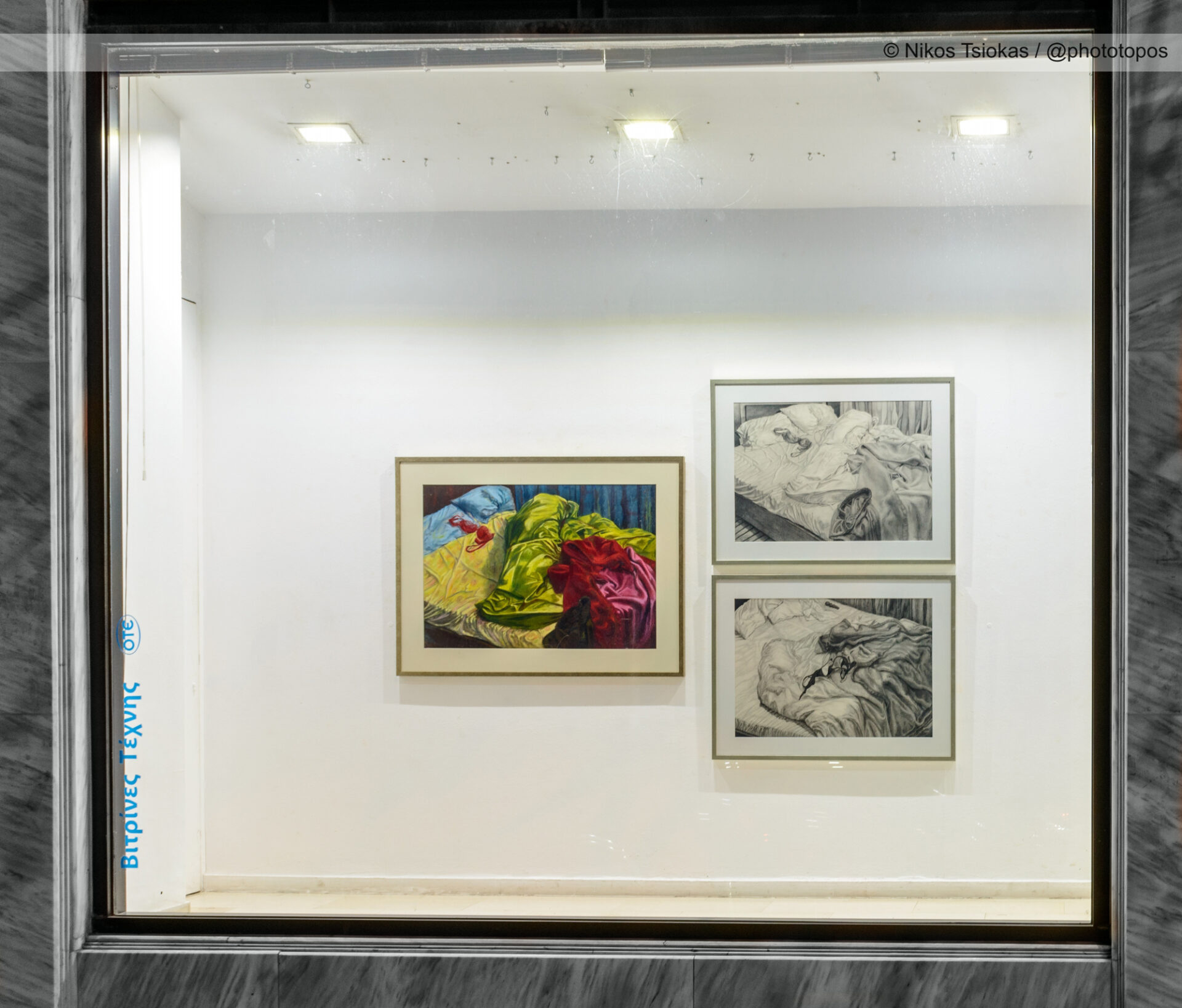 Διαφορετικές εκδοχές ενός εσωτερικού χώρου, στον οποίο κυριαρχεί το άδειο κρεβάτι με τα ανακατεμένα σεντόνια, αφηγούνται την απώλεια του αγαπημένου συντρόφου. Αποδίδοντας ένα τμήμα του κρεβατιού σε διαγώνια διάταξη, φέρνοντας το θέμα κοντά στο οπτικό μας πεδίο, η Καλτσίδου μας καλεί να εισχωρήσουμε στον προσωπικό της χώρο.