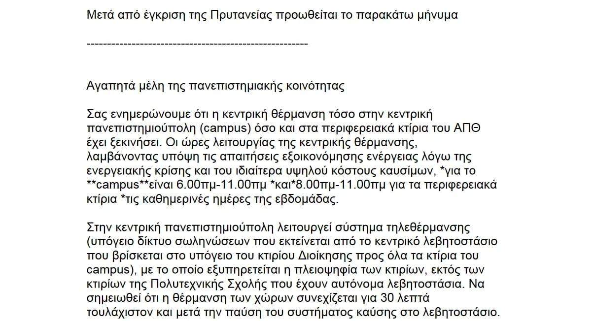 Όπως έγινε γνωστό, στο campus και στα περιφερειακά κτίρια του πανεπιστημίου, η θέρμανση θα λειτουργεί τις καθημερινές από τις 06:00 έως τις 11:00 και από τις 20:00 έως τις 23:00.