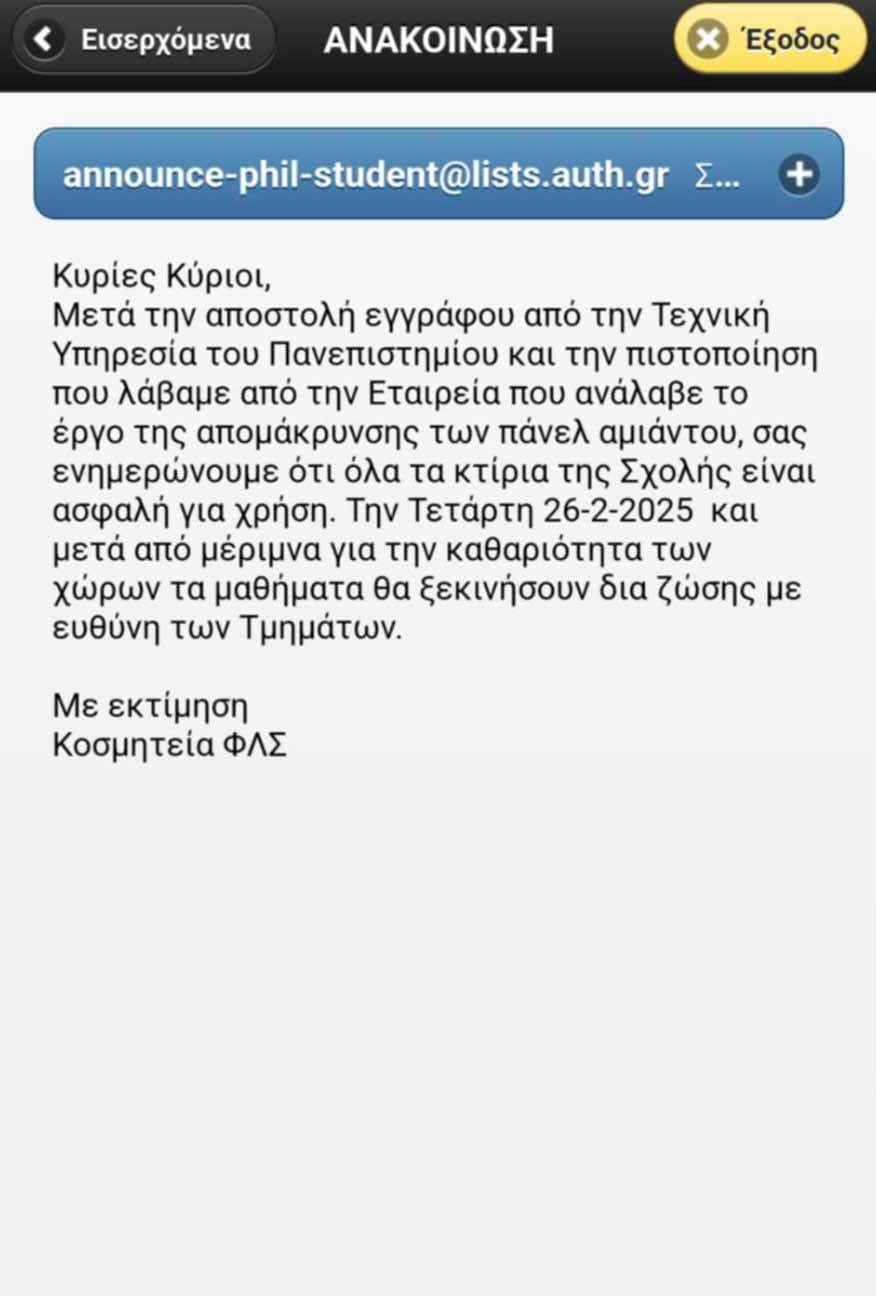 Παράλληλα, στους προπτυχιακούς και μεταπτυχιακούς φοιτητές της Φιλοσοφικής, στάλθηκε σήμερα μήνυμα, στο οποίο αναφέρεται ότι απεστάλη έγγραφο από την Τεχνική Υπηρεσία του Πανεπιστημίου, καθώς και η πιστοποίηση από την εταιρεία που ανέλαβε το έργο της απομάκρυνσης των πάνελ αμιάντου.