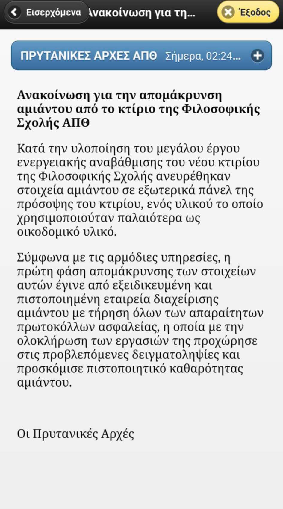 «Κατά την υλοποίηση του μεγάλου έργου ενεργειακής αναβάθμισης του νέου κτιρίου της Φιλοσοφικής Σχολής ανευρέθηκαν στοιχεία αμιάντου σε εξωτερικά πάνελ της πρόσοψης του κτιρίου, ενός υλικού το οποίο χρησιμοποιούταν παλαιότερα ως οικοδομικό υλικό.