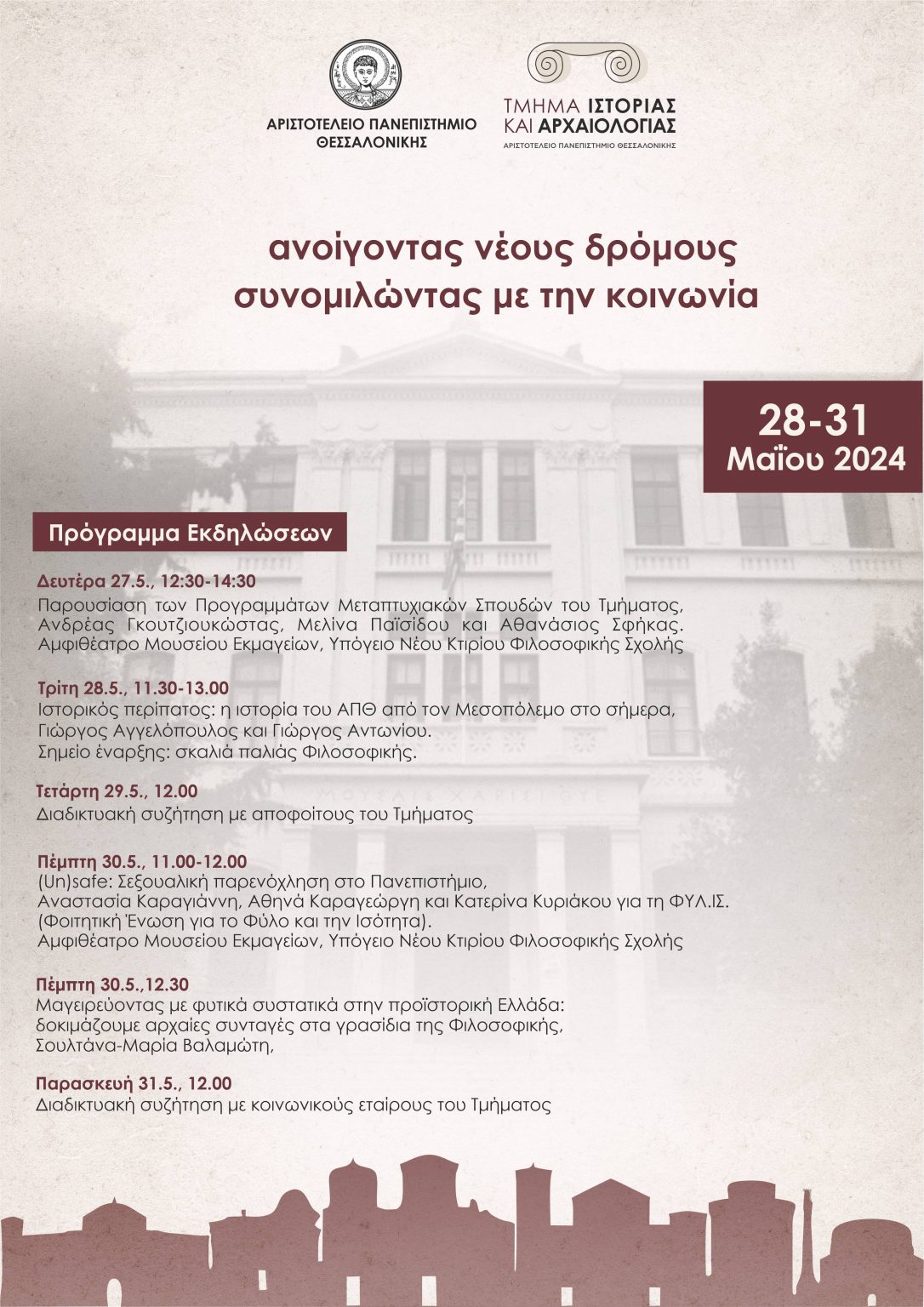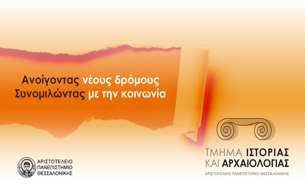 Με σκοπό να ενισχύσει την εξωστρέφεια και να προβάλλει την πλούσια ερευνητική δραστηριότητά του, το Τμήμα Ιστορίας και Αρχαιολογίας του Αριστοτελείου Πανεπιστημίου Θεσσαλονίκης αφιερώνει την εβδομάδα 27-31 Μαΐου 2024 σε ανοικτές εκδηλώσεις, υπό τον τίτλο «Ανοίγοντας νέους δρόμους, συνομιλώντας με την κοινωνία». Στη διάρκειά της θα πραγματοποιηθούν επαφές με φοιτήτριες/ες, κοινωνικούς εταίρους αλλά και δράσεις που στοχεύουν στην προβολή προς το ευρύ κοινό μέρους της ακαδημαϊκής και ερευνητικής συνεισφοράς του Τμήματος.