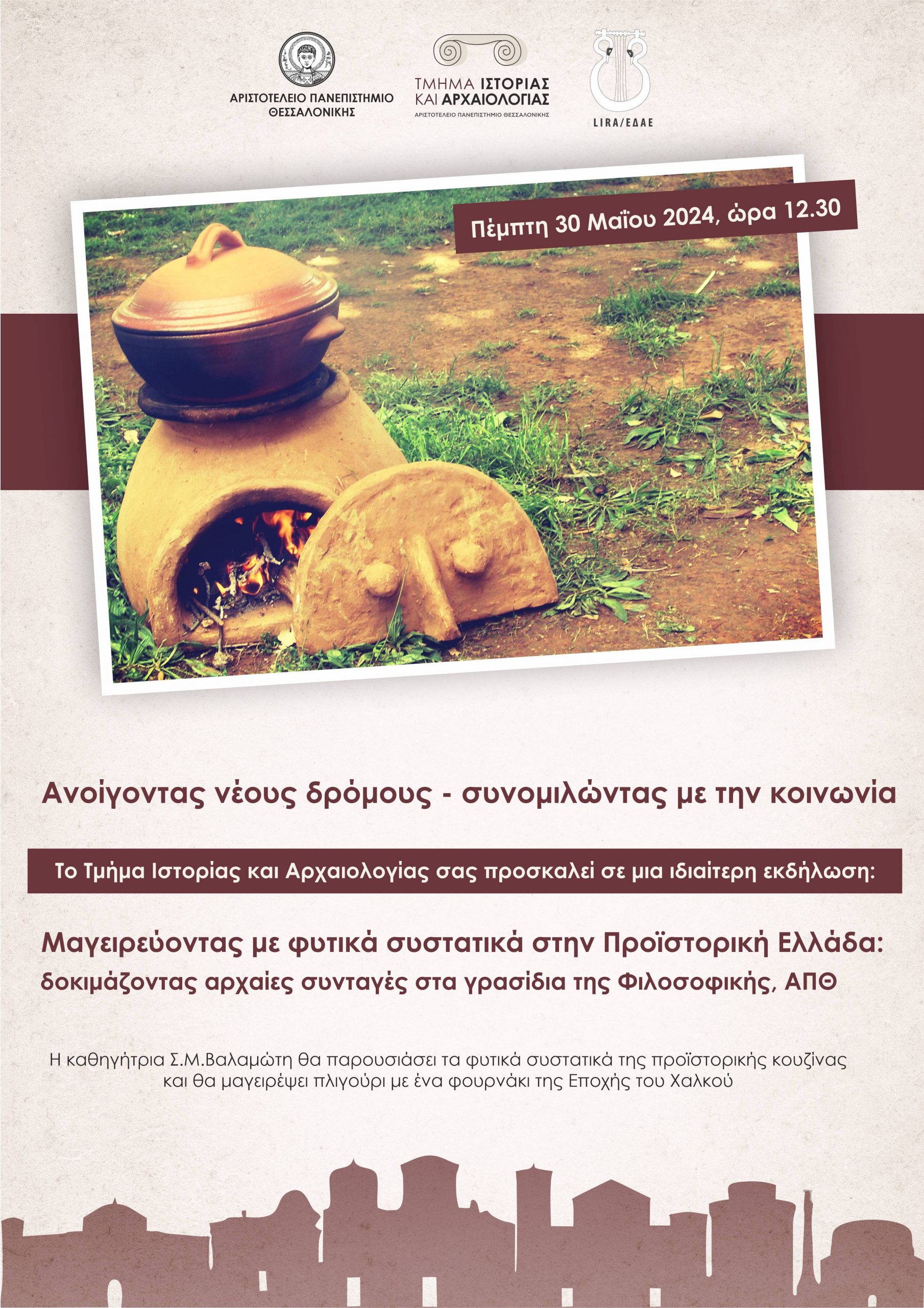 Την Πέμπτη (30/05), στον υπαίθριο χώρο στην Φιλοσοφική (στα γρασίδια), μια συνάδελφος της προϊστορικής αρχαιολογίας θα μαγειρέψει με τεχνικές και υλικά, που χρησιμοποιούσαν οι άνθρωποι της προϊστορικής εποχής. Έχουμε προσκαλέσει και τους φοιτητές Erasmus, ξένων πανεπιστημίων, από όλες τις σχολές του ΑΠΘ.