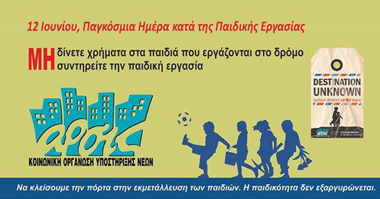 Η ΑΡΣΙΣ, με αφορμή την Παγκόσμια Ημέρα κατά της Παιδικής Εργασίας απευθύνει κάλεσμα στους πολίτες να συμβάλουν στην καταπολέμηση του φαινομένου και διοργανώνει εκδήλωση ευαισθητοποίησης την Τετάρτη 12 Ιουνίου, από τις 6 το απόγευμα μέχρι τις 11 το βράδυ, στη Νέα Παραλία, στις «Ομπρέλες» του Ζογγολόπουλου. Κατά τη διάρκεια της εκδήλωσης, σε μια στοχευμένη προσπάθεια ευαισθητοποίησης για τα παιδιά των φαναριών, ομάδα εργαζομένων της ΑΡΣΙΣ θα βρίσκεται σε φωτεινούς σηματοδότες κεντρικών δρόμων φορώντας μάσκες που θα αναγράφουν το όνομα και την ηλικία ενός ανήλικου παιδιού και θα μοιράζουν στους οδηγούς συνθήματα γραμμένα σε χαρτί, όπως: «Σε ξύπνησαν με τη βία νωρίς το πρωί για να πας στη δουλειά όταν ήσουν παιδί; Όχι; Μη συντηρείς την παιδική εργασία!».