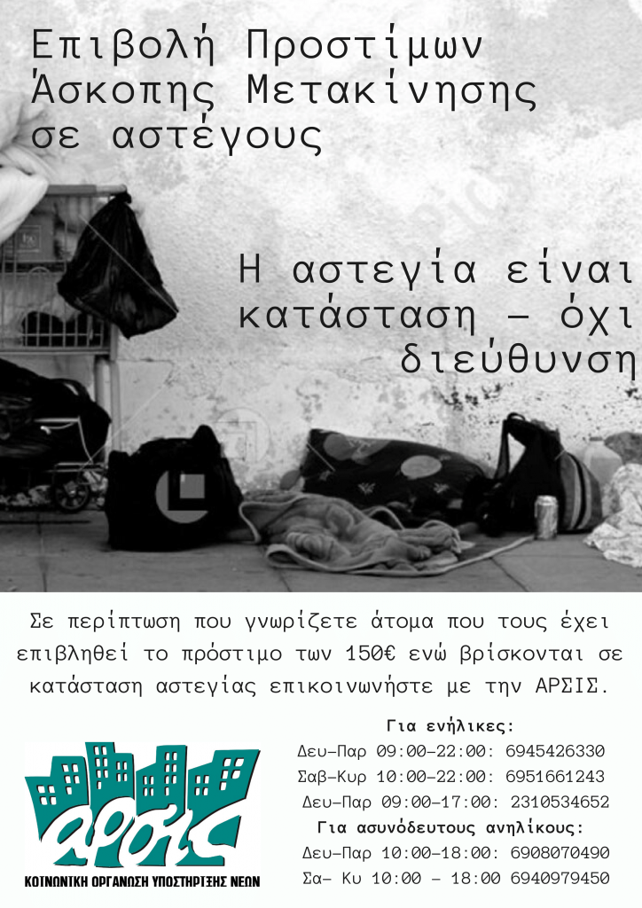 Επιπλέον, καλούμε τους πολίτες σε περίπτωση που γνωρίζουν άτομα στα οποία έχει επιβληθεί πρόστιμο, ενώ ζουν σε συνθήκες αστεγίας να επικοινωνούν με την ΑΡΣΙΣ προκειμένου να υποστηρίζονται στη διαδικασία των ενστάσεων.