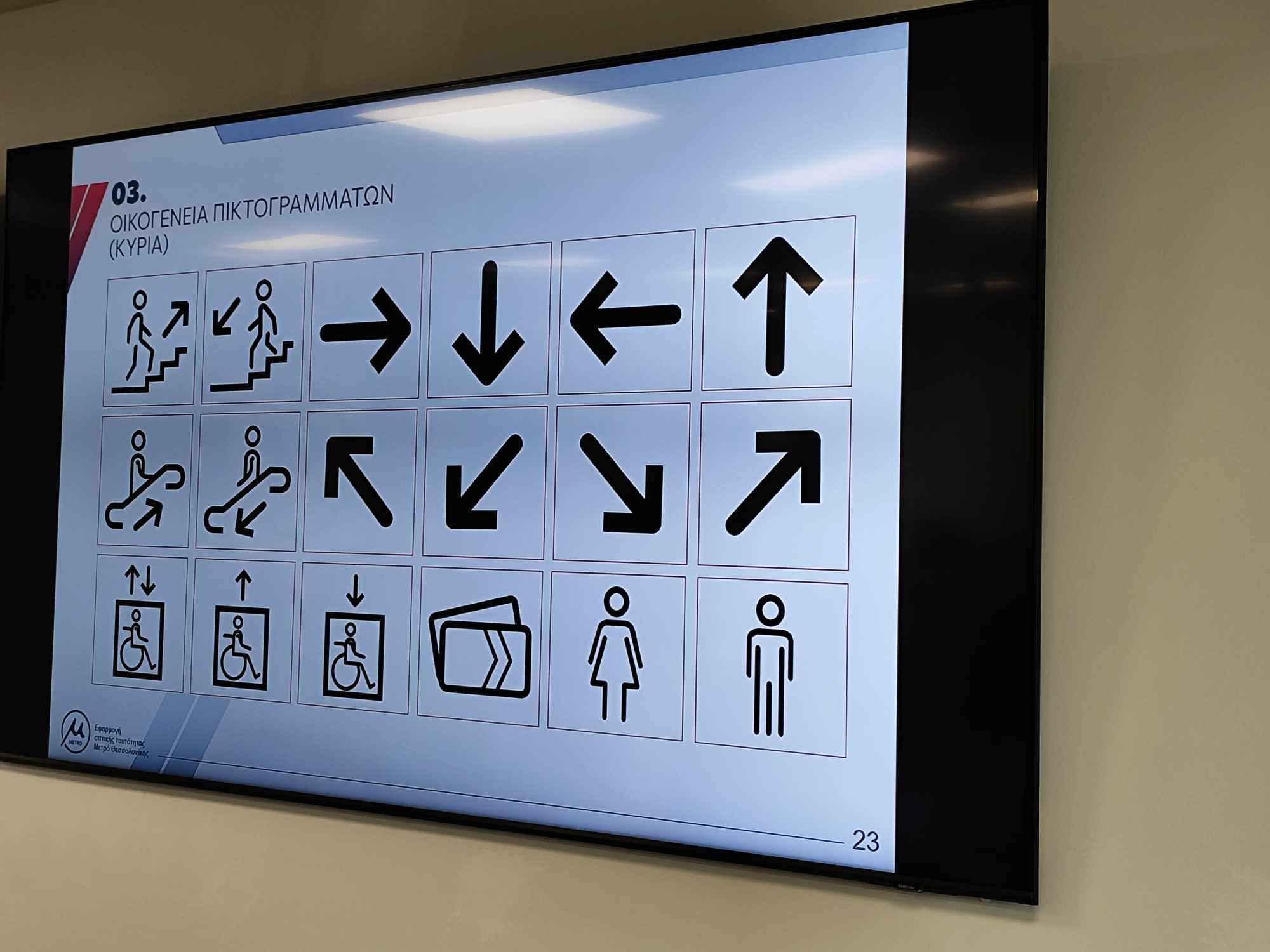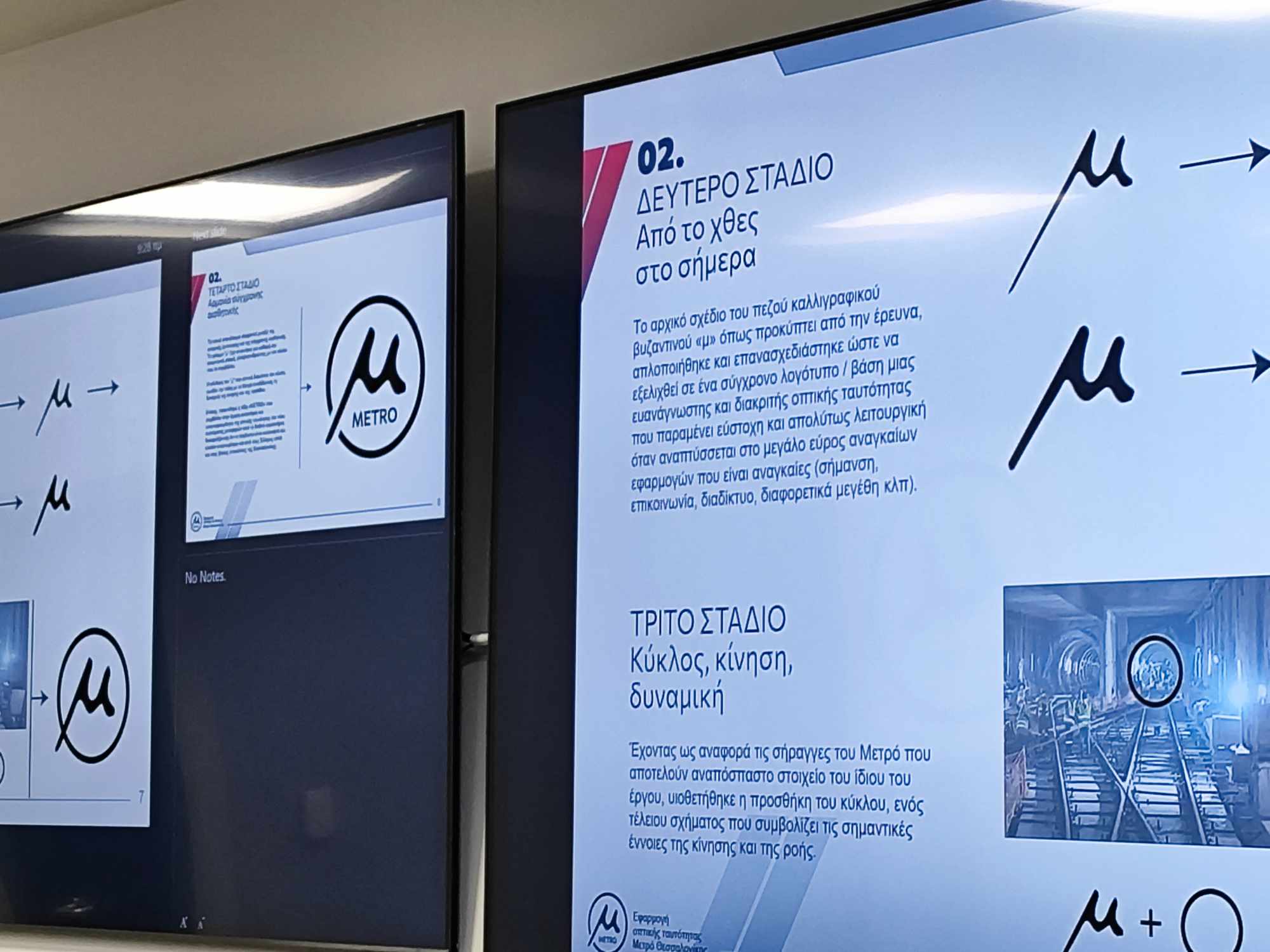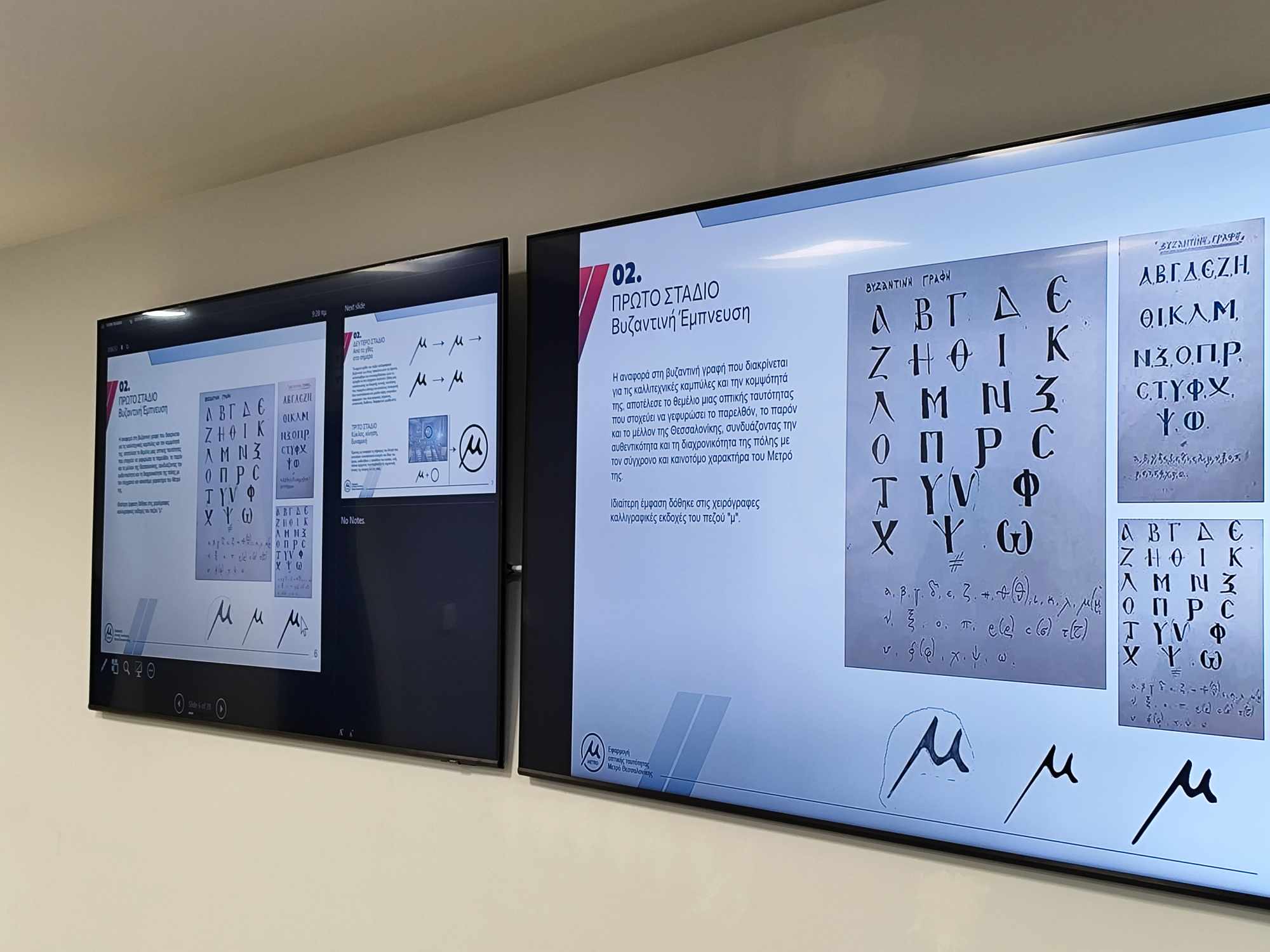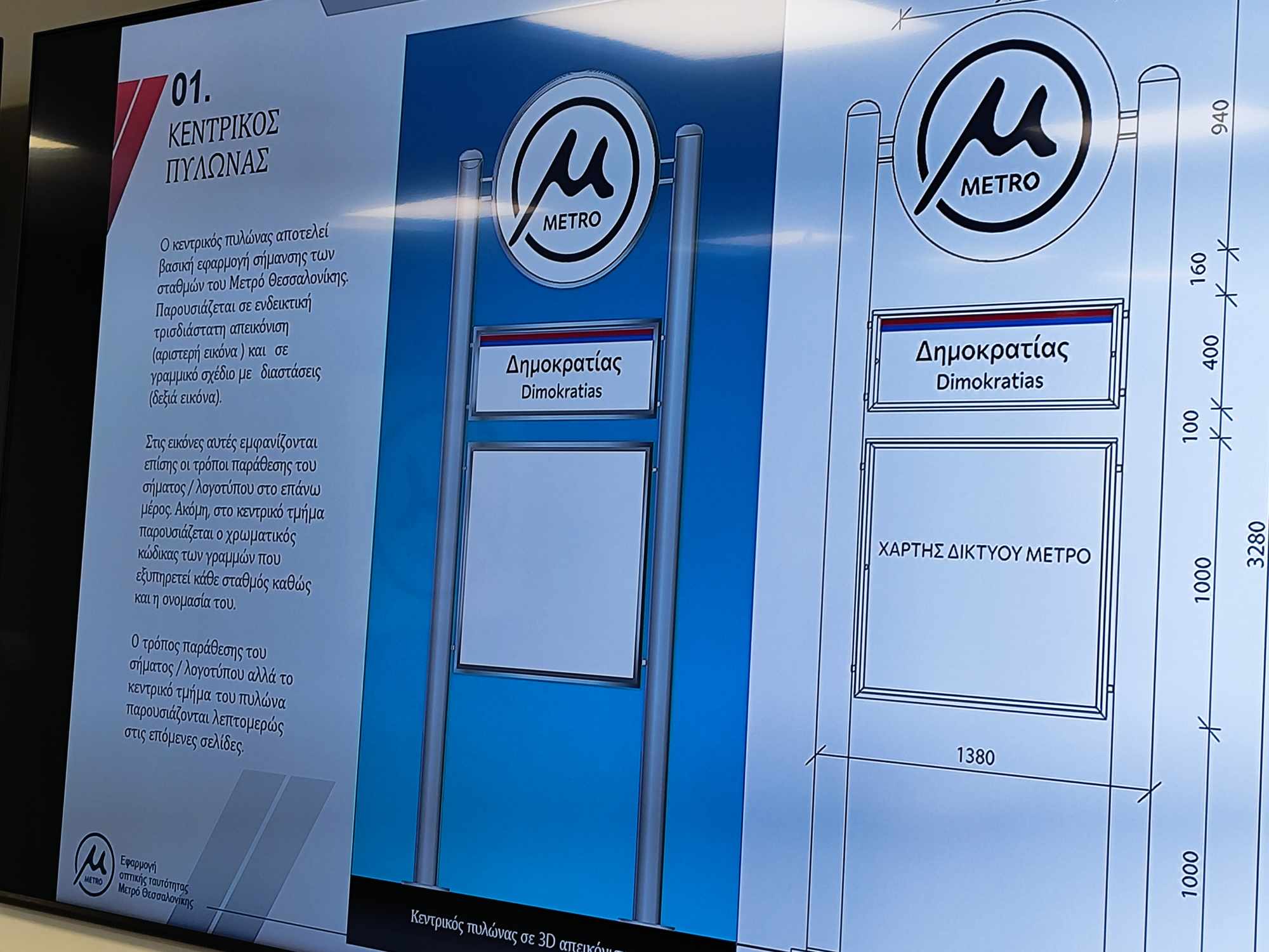 Η αναφορά στη βυζαντινή γραφή που διακρίνεται για τις καλλιτεχνικές καμπύλες και την κομψότητά της αποτέλεσε το θεμέλιο μιας οπτικής ταυτότητας που στοχεύει να γεφυρώσει το παρελθόν, το παρόν και το μέλλον της Θεσσαλονίκης, συνδυάζοντας την αυθεντικότητα και τη διαχρονικότητα της πόλης με τον σύγχρονο και καινοτόμο χαρακτήρα του Μετρό της.