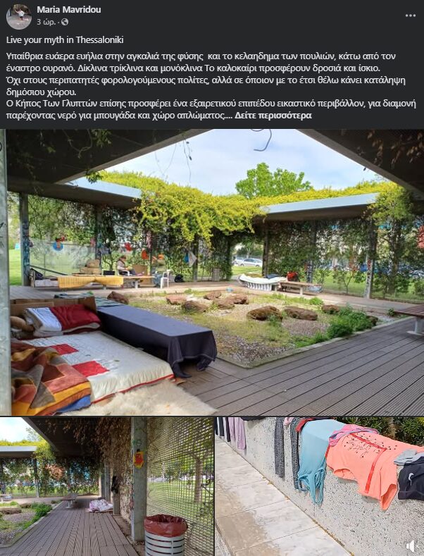 Το αυτοσχέδιο «σπιτικό» βρίσκεται στον Κήπο του Ήχου, ενώ παραδίπλα, στον Κήπο των Γλυπτών, έχουν απλωθεί ρούχα για στέγνωμα.