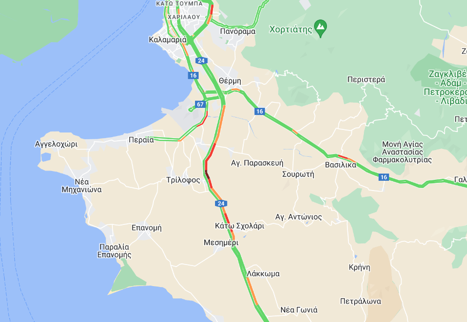 Αυξημένη κίνηση καταγράφεται από το Μεσημέρι, ενώ η κυκλοφοριακή κατάσταση βελτιώνεται λίγο πριν από τη Θέρμη.