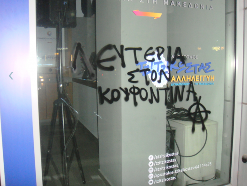 Παρέμβαση με σπρέι, συνθήματα και τρικάκια πραγματοποίησαν χθες το βράδυ μέλη του ευρύτερου αντιεξουσιαστικού χώρου, στο εκλογικό κέντρο του Απόστουλου Τζιτζικώστα στη Θεσσαλονίκη.