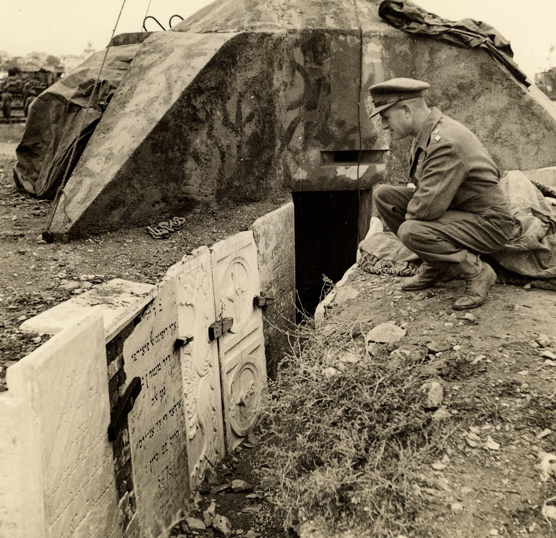Πίσω στην φωτογραφία, οι πλάκες ενίσχυσης της γερμανικής οχύρωσης προφανώς προέρχονται από το κατεστραμμένο από τους Ναζί κατακτητές Εβραϊκό νεκροταφείο της πόλης. Ο Βρετανός αξιωματικός μοιάζει μπερδεμένος από το θέαμα που αντικρίζει. Φαίνεται να μην μπορεί να πιστέψει τα επίπεδα μίσους και φρικαλεότητας τα οποία μπορεί να αγγίξει η ανθρώπινη φύση. Και να μην θέλει να πιστέψει, πόσες ανθρώπινες ιστορίες πόνου, εξευτελισμού, θανάτου και καταστροφής κρύβονται πίσω από αυτές τις πλάκες.