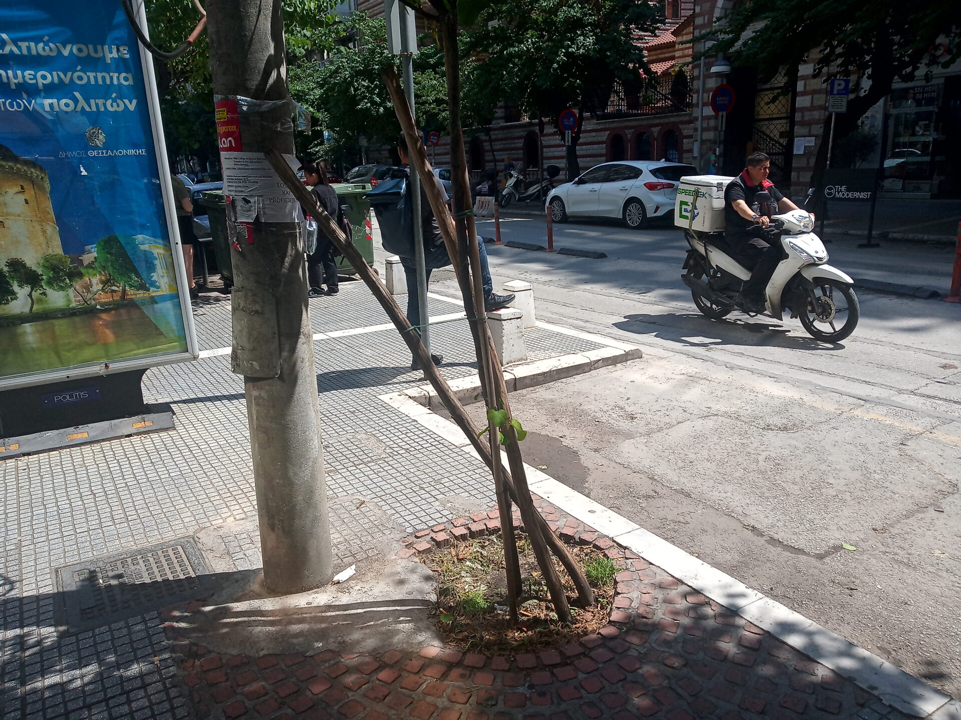 Η εικόνα άλλωστε ενός μικρού δένδρου, κάπου μέσα στην πόλη, στριμωγμένο δίπλα σε παρκαρισμένα αυτοκίνητα και κάδους απορριμμάτων, σε στενά τσιμεντένια πεζοδρόμια, ξερό κι απότιστο, που παλεύει να επιβιώσει δεν είναι ασυνήθιστη στη Θεσσαλονίκη, ούτε η εξαίρεση, σε ένα «κανονικό» περιβάλλον.