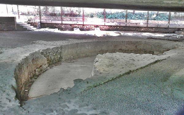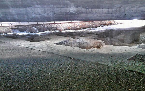 Περπατώντας στο πλακόστρωτο κάτω από τα δέντρα αισθάνεσαι ευχάριστα και σε περιμένει άλλη μια έκπληξη. Μετά από λίγα μέτρα βρίσκεσαι να περπατάς παράλληλα με μια φροντισμένη περιοχή κάτω απ΄τον αυτοκινητόδρομο, πλήρως ανασκαμένη και επιμελημένη από τους αρχαιολόγους. Ένα συρματόπλεγμα σε χωρίζει από ένα ακόμη κομμάτι της ιστορίας της πόλης για το οποίο ίσως δεν γνωρίζεις και τίποτα. Δεν υπάρχει καμιά σήμανση που να σε διευκολύνει για να μάθεις και να αναγνωρίσεις τα αρχαιολογικά ευρήματα.Και είναι πραγματικά κρίμα που δεν φροντίζει η εφορία και ο δήμος να κάνουν γνωστό το μνημείο με σήμανση που να οδηγεί σ΄αυτό αλλά και με μια επιγραφή που εν συντομία να το περιγράφει.