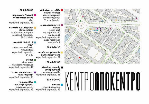 Η εκδήλωση, με τον τίτλο ΚΕΝΤΡΟΑΠΟΚΕΝΤΡΟ, διοργανώνεται από ομάδα κατοίκων και εργαζομένων της περιοχής Πλατείας Αντιγονιδών. Πραγματοποιείται για πρώτη φορά και σκοπός της ήταν, κατά τη διάρκεια της προετοιμασίας αλλά και κατά την υλοποίησή της, να φέρει σε επαφή ανθρώπους που ζουν κοντά και ενδιαφέρονται να αναθεωρήσουν τη γειτονιά τους.