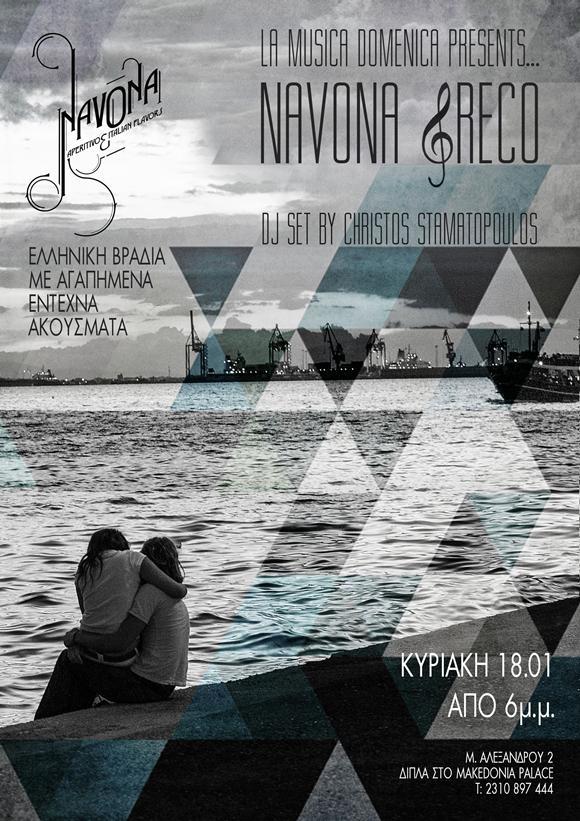 Αυτήν την Κυριακή το Navona προσκαλεί τους Θεσσαλονικείς στο πρώτο ελληνικό DJ event της χρονιάς, με τον Χρήστο Σταματόπουλο στα decks. Η βραδιά αποτελεί αφιέρωμα στους πλέον αγαπημένους και καταξιωμένους Έλληνες δημιουργούς και ερμηνευτές, όπως Αλεξίου, Μαχαιρίτσας, Πυξ Λαξ, Μποφίλιου, Μαραβέγιας, Κραουνάκης, Ζουγανέλη, Αρβανιτάκη, Emigre, Μόνικα, Imam Baildi και άλλοι.