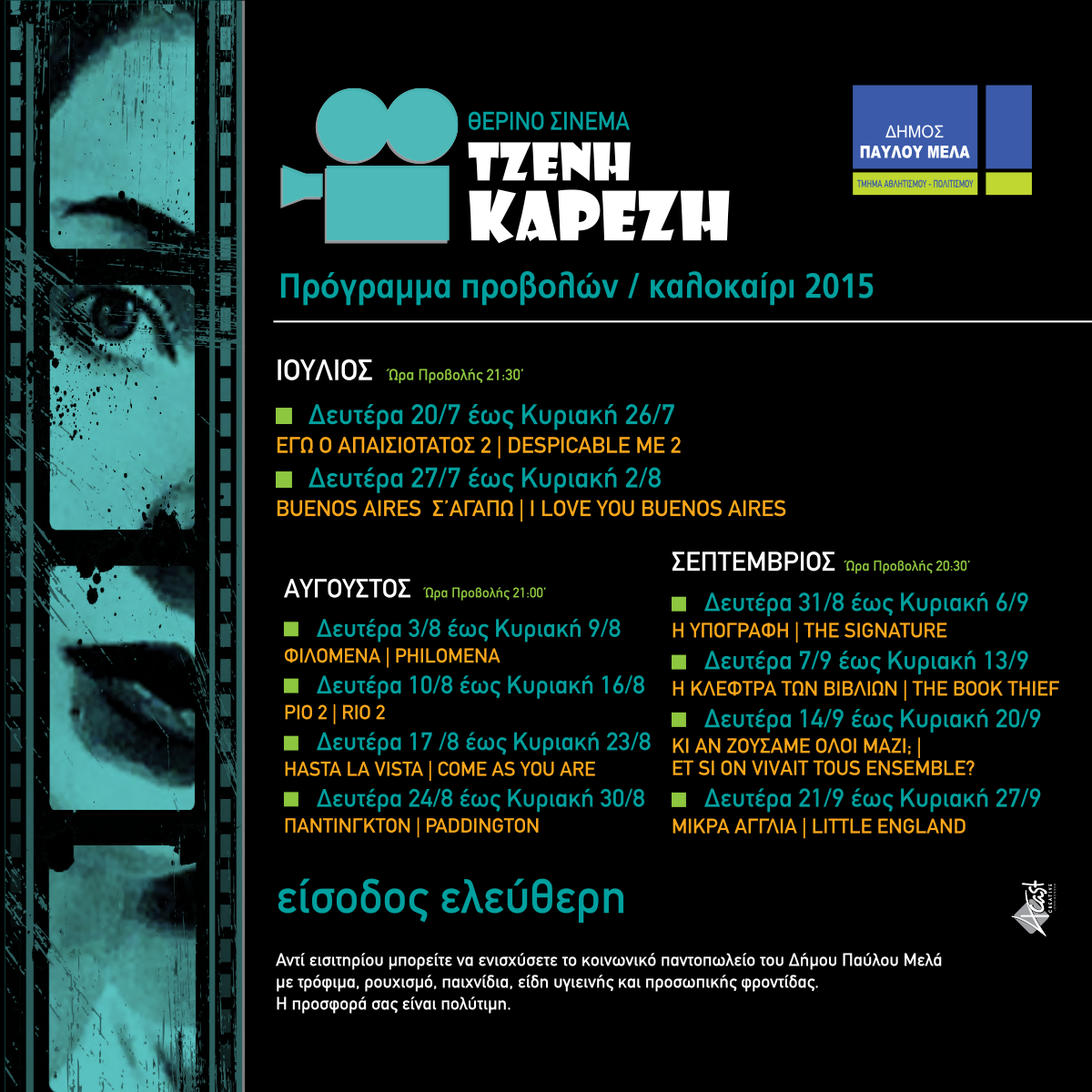 Ο Θερινός Κινηματογράφος “Τζένη Καρέζη” στο Δήμο Παύλου Μελά, λόγω της δύσκολης κοινωνικο-οικονομικής κατάστασης αποφασίστηκε να λειτουργήσει φέτος δωρεάν για όλους τους πολίτες, δίνοντας την ευκαιρία σ’ αυτούς που δε θα έχουν την ευκαιρία να ξεφύγουν από το άγχος της πόλης, να διασκεδάσουν, να αλλάξουν παραστάσεις, να κάνουν τη δική τους εκδρομή στην τέχνη του κινηματογράφου και να μαγευτούν στο γεμάτο χρώμα, συναίσθημα και φαντασία κόσμο του. Στο πλαίσιο της λειτουργίας του κινηματογράφου θα συγκεντρωθούν τρόφιμα για το Κοινωνικό Παντοπωλείο του Δήμου. “Φέτος το σινεμά, ανοίγει μετά από ένα μικρό διάλειμμα και στόχος του είναι να επαναφέρει μια πολιτιστική δροσιά στις καλοκαιρινές μας νύχτες. Σε ένα δροσερό περιβάλλον, που ευελπιστούμε να γίνει το καταφύγιο της ψυχής μας στις δύσκολες κοινωνικοοικονομικές συνθήκες που βιώνουμε, σας περιμένουμε να χαρούμε μαζί τις προβολές του, σ ένα κατάφυτο πάρκο γεμάτο αγιόκλημα και γιασεμιά” ανέφερε σε δηλώσεις του ο Δήμαρχος Παύλου Μελά Δημήτριος Δεμουρτζίδης. “Με βασικό μας μέλημα την ποιοτική βελτίωση της καθημερινότητας των δημοτών μας, επιλέξαμε ταινίες που θα ψυχαγωγήσουν και θα διασκεδάσουν μικρούς και μεγάλους και παράλληλα θα φέρουν πιο κοντά τον κόσμο στην κουλτούρα του θερινού κινηματογράφου. Επιπλέον, αναλογιζόμενοι το κλίμα των ημερών επιλέξαμε συνειδητά οι προβολές να είναι με ελεύθερη είσοδο, θέτοντας κατ’ αυτόν τον τρόπο, τον πολιτισμό στην υπηρεσία του πολίτη. Αντί αυτού ο καθένας μας ας πληρώσει το δικό του «εισιτήριο αγάπης», φέρνοντας τρόφιμα και είδη που μπορούν να διατεθούν στο Κοινωνικό Παντοπωλείο του Δήμου” επισήμανε κλείνοντας ο κ. Δεμουρτζίδης. Πάρτε λοιπόν μαζί σας τρόφιμα, ρουχισμό, παιχνίδια, είδη υγιεινής και προσωπικής φροντίδας κι ελάτε να καταθέσετε το δικό σας αντίτιμο στα Δυτικά. *20/7-27/9, Θερινό σινεμά “Τζένη Καρέζη”, Πολίχνη, Ώρα προβολής: 21.30, Είσοδος: Ελεύθερη