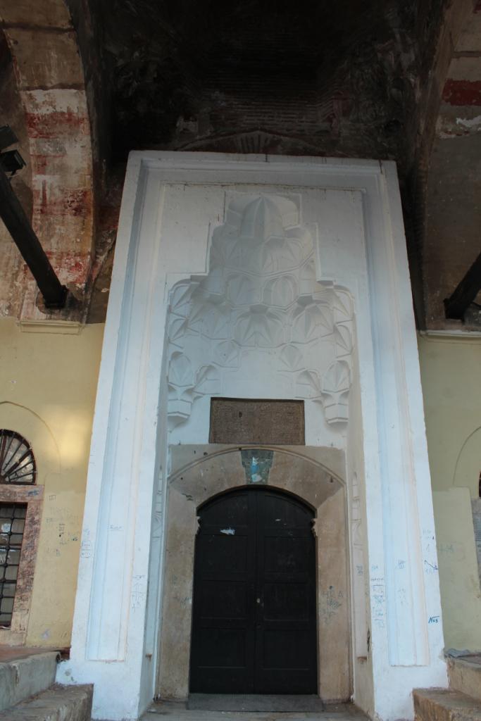 Διασώζεται ένα μέρος της στους θόλους (γεωμετρικά συμπλέγματα), στα “σφαιρικά τρίγωνα” ιδιαίτερα του δεύτερου τρούλου και στους τοίχους, όπου υπάρχουν και ρήσεις από το κοράνι. Στο βάθος του κεντρικού χώρου, απέναντι από την είσοδο και στον τοίχο που βρίσκεται προς την μεριά της Μέκκα, υπάρχει το Μιχράμπ. Στα βόρεια και στα νότια, υπάρχουν από δύο μικρότεροι τετράγωνοι χώροι στεγασμένοι με τρούλους. Στα δυτικά μπροστά στην κύρια είσοδο, υπάρχει ανοιχτή στοά με τόξα που στηρίζονται σε έξι κίονες. Η στοά είναι καλυμμένη με πέντε τρούλους, από τους οποίους ο κεντρικός είναι ο ψηλότερος. Στη βορειοδυτική γωνία του κτιρίου σώζεται η βάση, κατασκευασμένη με ορθογώνιους πωρόλιθους.