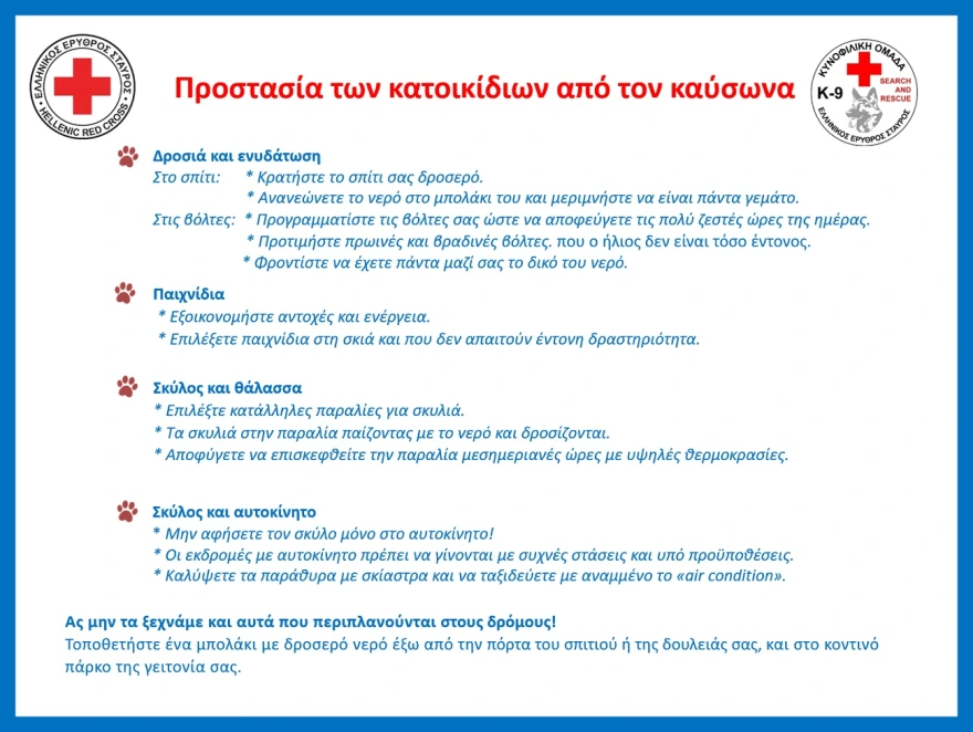 Ειδική αναφορά κάνει ο Ερυθρός Σταυρός και για τα αδέσποτα, που καλεί τους πολίτες να τοποθετήσουν ένα μπολάκι νερό έξω από την πόρτα του σπιτιού ή της δουλειάς τους, και στο κοντινό πάρκο της γειτονιάς τους.