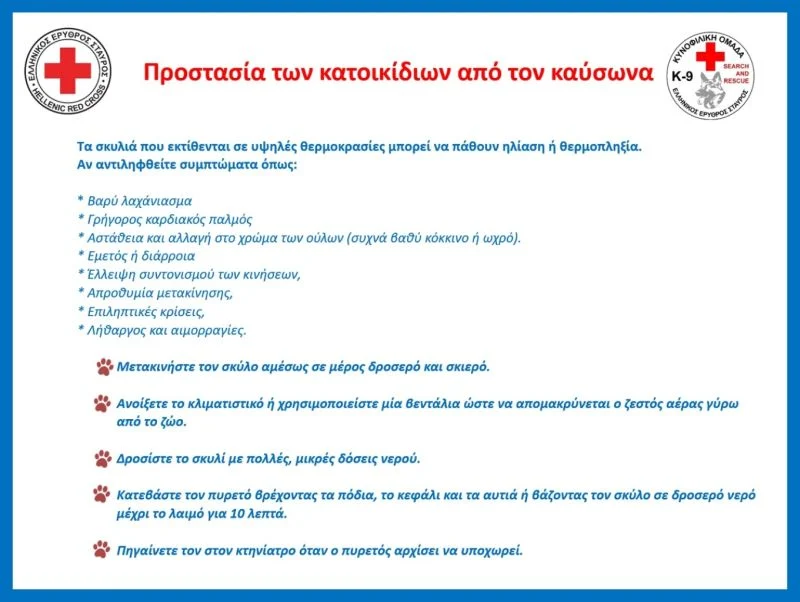 Παράλληλα, οι οδηγίες αφορούν και σε περιπτώσεις σκυλιών που εκτίθενται σε υψηλές θερμοκρασίες και ενδεχομένως θα πάθουν ηλίαση ή θερμοπληξία.