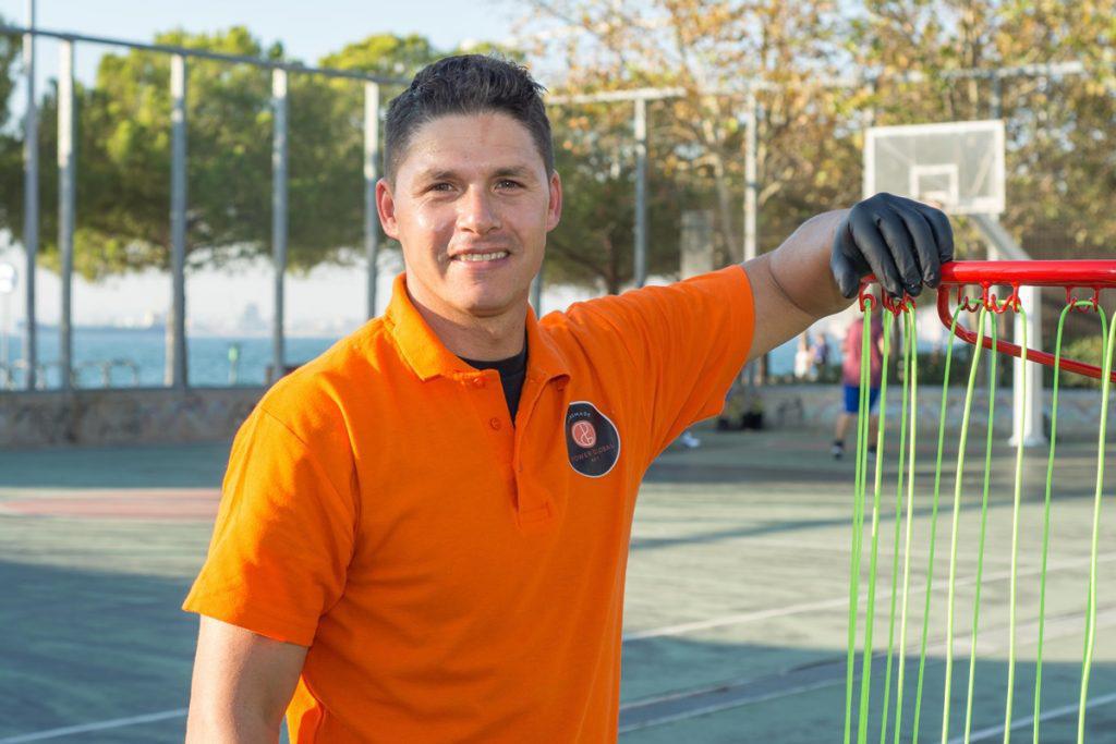 “…Πρότεινα να αλλάξουμε γήπεδο -η Μίκρα έχει πέριξ και κλειστά και ανοιχτά άλλα γήπεδα- ταυτόχρονα όμως έπαιζαν και άλλοι οπότε έπρεπε να βρω άλλο διχτάκι. Βγαίνω έξω και ψάχνω να αγοράσω, δεν βρίσκω πουθενά… επιστρέφω και βγάζω τα κορδόνια από τα παπούτσια μου. Αφού φιλοσόφησα πώς θα μπορούσε να “μπαλωθεί” το κομμένο δίχτυ -δεν ήταν κάτι έξυπνο έπρεπε να κάνω κάτι πρακτικό για να τελειώσει ο αγώνας- παίρνω μια σκάλα και δένω το διχτάκι και είχαμε μετά και αυτό το χειροκρότημα και από τους δύο… Την ώρα που ήμουν πάνω στο στεφάνι, αυτό το άγχος που μου δημιουργούσε, να τελειώσει ο αγώνας να κερδίσουμε, λειτουργούσε κάπως απροσδιόριστα στην σκέψη μου. Από την μία ήθελα να κερδίσει η ομάδα από την άλλη μου σφηνώθηκε και η ιδέα. Όταν κάθισα στον πάγκο μετά, άρχισα να σκέφτομαι αν είναι καλή η ιδέα. Επιστρέφοντας σπίτι, έκοψα έναν κουβά για να δημιουργήσω ένα στεφάνι, έβγαλα όσα κορδόνια είχα και ξεκίνησα να φιλοσοφώ μια ιδέα χειροποίητη γιατί κανονικά έπρεπε να έχεις και τα εξαρτήματα. Το πρώτο διχτάκι το έκανα σε 4 ώρες. Τώρα το φτιάχνω σε 40 λεπτά και έχω φτάσει σε σημείο να το κάνω ακόμα και σε 12 λεπτά.”