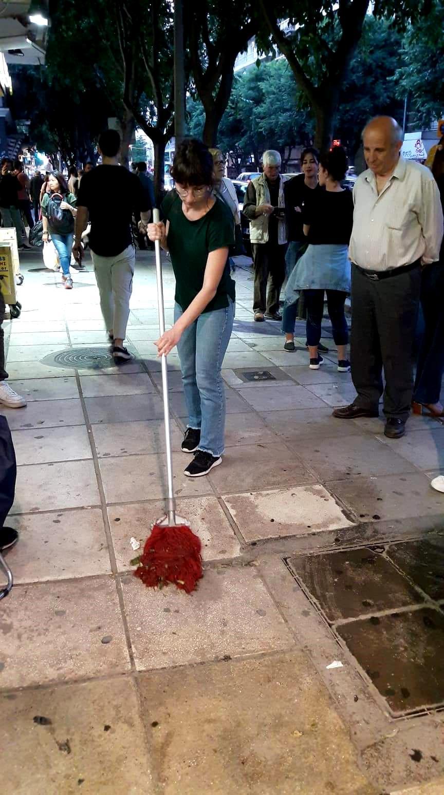 Έτσι αποφάσισα να αποτυπώσω τα ερωτήματα σ’ ένα κείμενο και κάνοντας μια πραγματική δράση, όπως είναι το σφουγγάρισμα. Στην συνέχεια, βέβαια, η δράση εξελίχθηκε σε μια πορεία με τον κουβά και τη σφουγγαρίστρα ανά χείρας», αναφέρει στην Parallaxi.