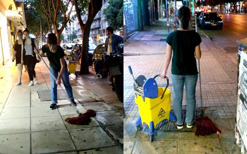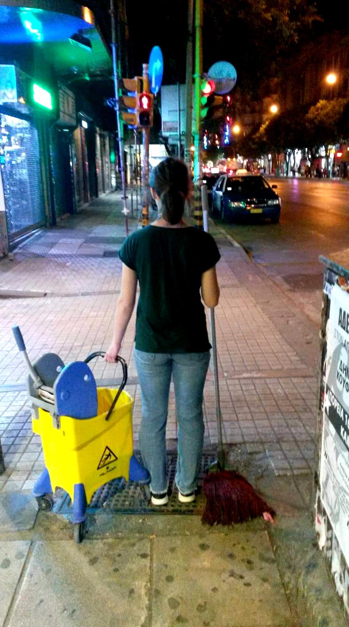 Χθες το βράδυ, μια νεαρή κοπέλα εμφανίστηκε πάνω στην Εγνατία, στη στάση της Αγίας Σοφίας, με έναν κουβά και μια σφουγγαρίστρα και ξεκίνησε να σφουγγαρίζει το πεζοδρόμιο. Αν ο δρόμος σου σε έβγαλε στο σημείο, είναι πολύ πιθανό να την είδες εκεί. Δεν ανήκει στο Τμήμα Καθαρισμού του δήμου, ο λόγος της παρουσίας της υπήρξε διαφορετικός.