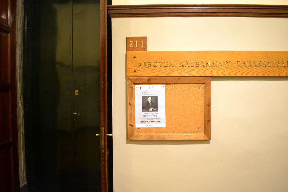 Από μερικά μέτρα μακριά, όρθιος ανάμεσα στο πλήθος, ο Τζέφρι Ευγενίδης μοιάζει περισσότερο με επιστήμονα, κλεισμένο επί χρόνια σε εργαστήρια προς αναζήτηση ενός ευρήματος που θα αλλάξει τον κόσμο για πάντα, παρά για συγγραφέα βραβευμένο με Πούλιτζερ που χτίζει πολυδαίδαλα σύμπαντα με τη φαντασία του στο χαρτί.