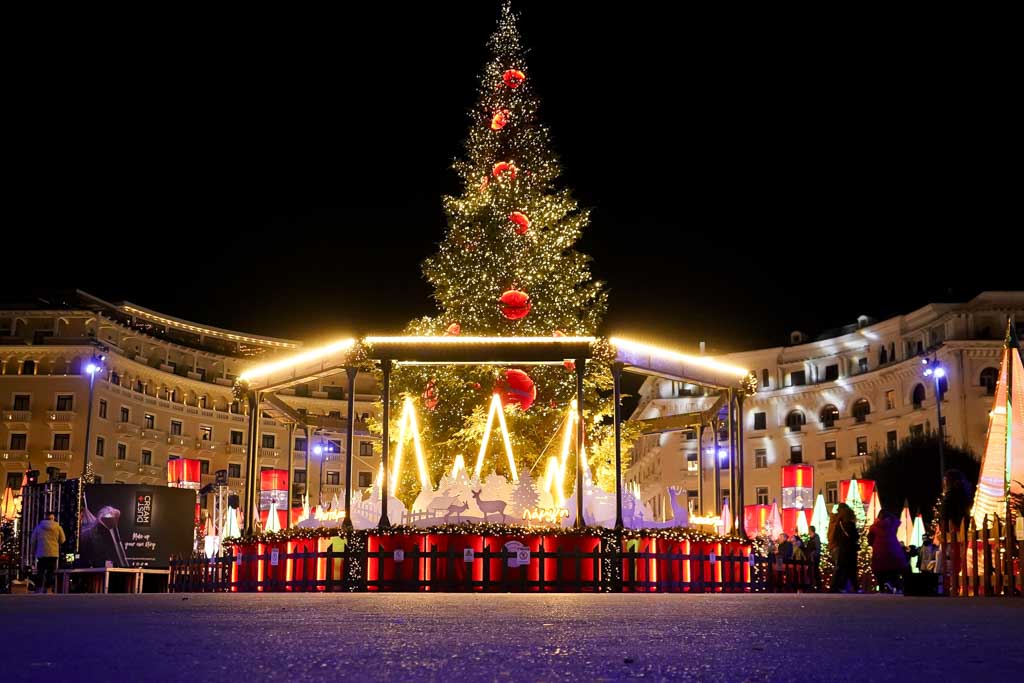Ένας τεράστιος Άγιος Βασίλης, μεγάλο έλατο ύψους 20 μέτρων από τον Ταξιάρχη Χαλκιδικής, τρισδιάστατα αρκουδάκια, ξωτικά και ελαφάκια και μία άμαξα συνθέτουν το σκηνικό στην πλατεία Αριστοτέλους.