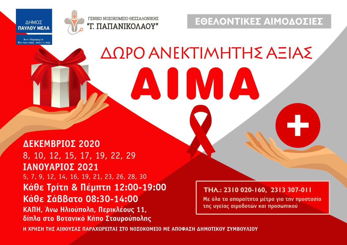 Την κοινωνική της ευαισθησία αποδεικνύει γι’ άλλη μια φορά η Αντιδημαρχία Κοινωνικής Πολιτικής του Δήμου Παύλου Μελά, που θέλοντας να συνδράμει στο έργο του Γ.Ν.Θ. «Γεώργιος Παπανικολάου», παραχώρησε με απόφαση Δημοτικού Συμβουλίου τη χρήση δημοτικού χώρου, για διοργάνωση 20 εθελοντικών αιμοδοσιών τους μήνες Δεκέμβριο του 2020 και Ιανουάριο του 2021.