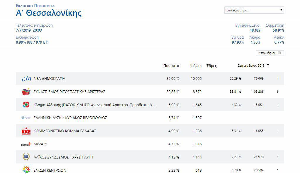 Α’ Θεσσαλονίκης – Τα πρώτα αποτελέσματα στην ενσωμάτωση 8,99% στο ΥΠΕΣ: