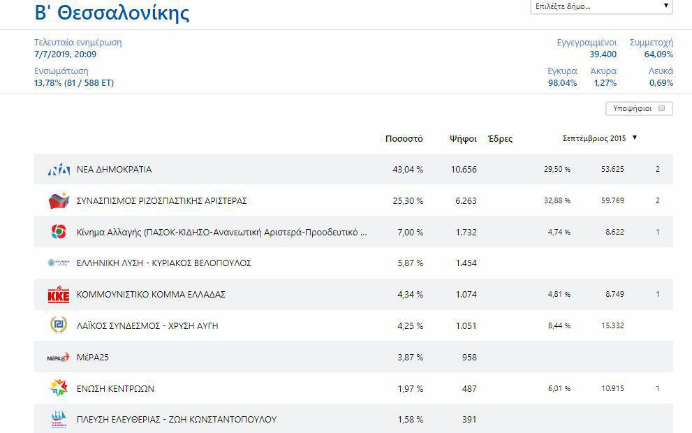 Β’ Θεσσαλονίκης – Τα πρώτα αποτελέσματα στην ενσωμάτωση 13,78% στο ΥΠΕΣ: