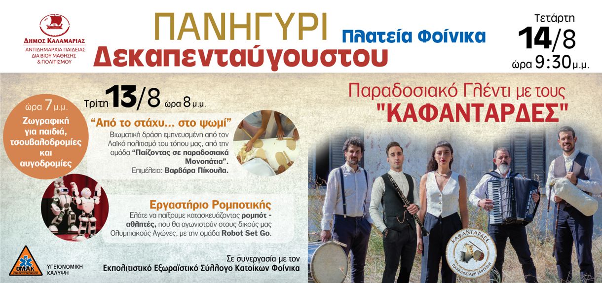 Στις 14/8, παραμονή της εορτής της Κοιμήσεως της Θεοτόκου, συντροφιά στο μεγάλο γλέντι που θα στηθεί, θα κρατήσουν στους επισκέπτες οι «Καφαντάρδες», οι οποίοι απαρτίζονται από τους: Στάθη Παρασκευόπουλο στα κρουστά, Γιάννη Γαλίτη στο κλαρίνο, Νατάσα Τσακηρίδου στο τραγούδι, Νίκο Μπόζογλου στο ακορντεόν και Τριαντάφυλλο Κωνσταντινίδη στη γκάιντα και καβάλ. Θα χορέψουν τα χορευτικά τμήματα του Εκπολιτιστικού Εξωραϊστικού Συλλόγου Κατοίκων Φοίνικα.