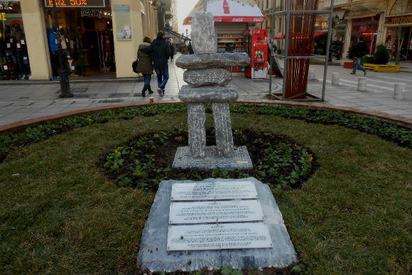 Το γλυπτό Inukshuk που τοποθετήθηκε στο κέντρο του παρτεριού στη συμβολή των οδών Μακένζυ Κινγκ και Αγίας Σοφίας φιλοτέχνησε ο γλύπτης και αρχιτέκτονας Γιώργος Παυλίδης. Ιnukshuk στη γλώσσα των ιθαγενών της φυλής Ιnuit του Καναδά, σημαίνει «με τη μορφή ανθρώπου». Οι Inuit είναι οι αυτόχθονες κάτοικοι των αρκτικών περιοχών του Καναδά και κατασκεύαζαν αυτά τα πέτρινα ορόσημα κατά μήκος των βορείων ακτών του Καναδά για να εντοπίζουν τα μονοπάτια που ακολουθούσαν οι ταξιδιώτες της εποχής, τις περιοχές κυνηγιού και τους τόπους λατρείας. Ήταν κατασκευασμένα με ακατέργαστες πέτρες και παραδοσιακά δήλωναν ότι “κάποιος ήταν εδώ” δηλαδή ότι ο ταξιδιώτης βρίσκεται “στο σωστό μονοπάτι”. Tο μέγεθός τους διέφερε από γλυπτό σε γλυπτό. Η εικόνα ενός τέτοιου γλυπτού αποτέλεσε και το logo των Ολυμπιακών αγώνων που διεξήχθησαν στο Βανκούβερ το 2010.