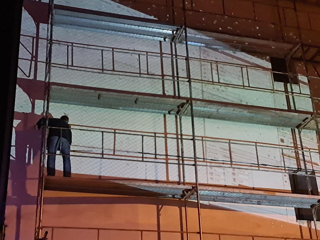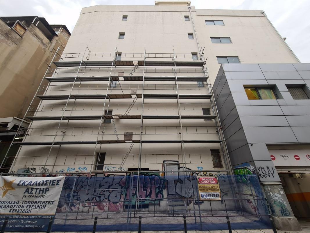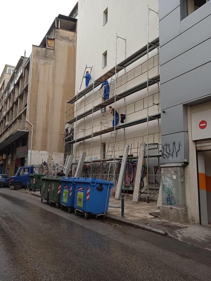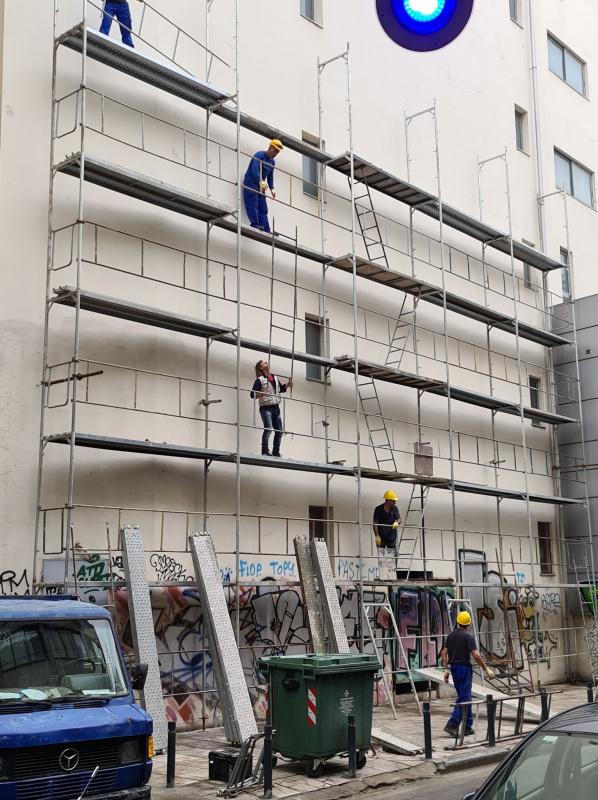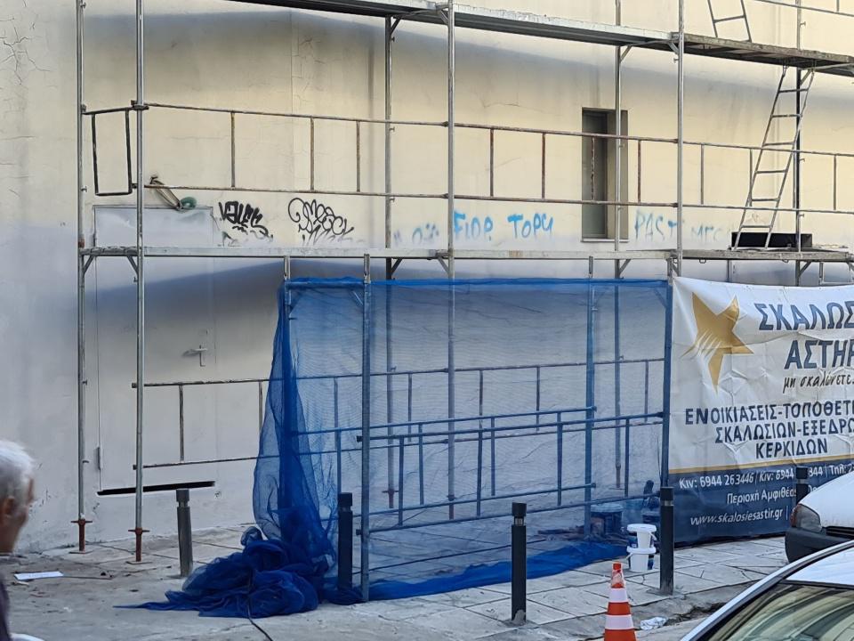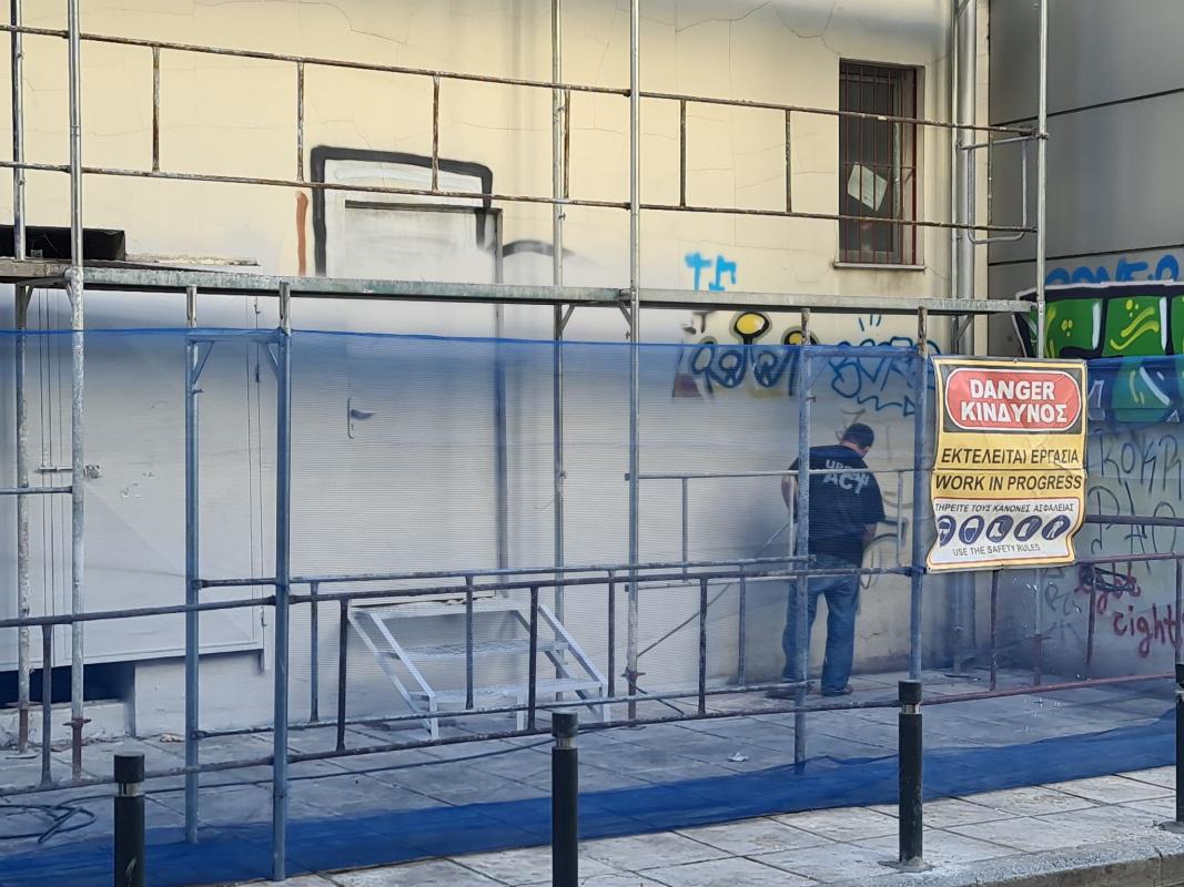 Οι εργασίες έχουν ξεκινήσει με την τοποθέτηση σκαλωσιάς και τον καθαρισμό του τοίχου.