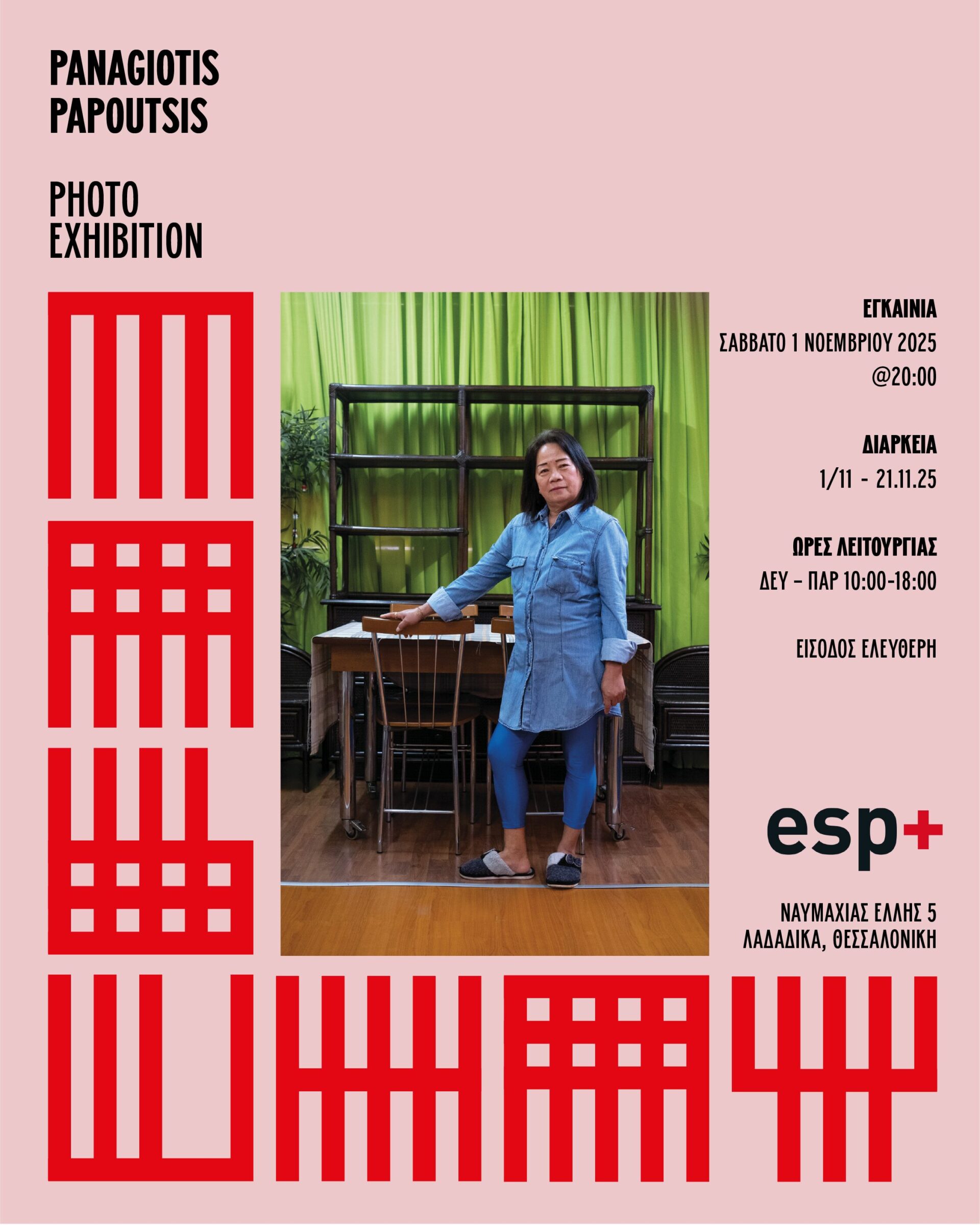 Εγκαίνια: Σάββατο 01.11.2025 / 20.00 Διάρκεια: 1.11.25–21.11.25 Ώρες λειτουργίας: Δευτέρα–Παρασκευή 10:00–18:00 esp+ gallery, Ναυμαχίας Έλλης 5, Λαδάδικα, Θεσσαλονίκη www.esp.gr | www.panagiotispapoutsis.gr