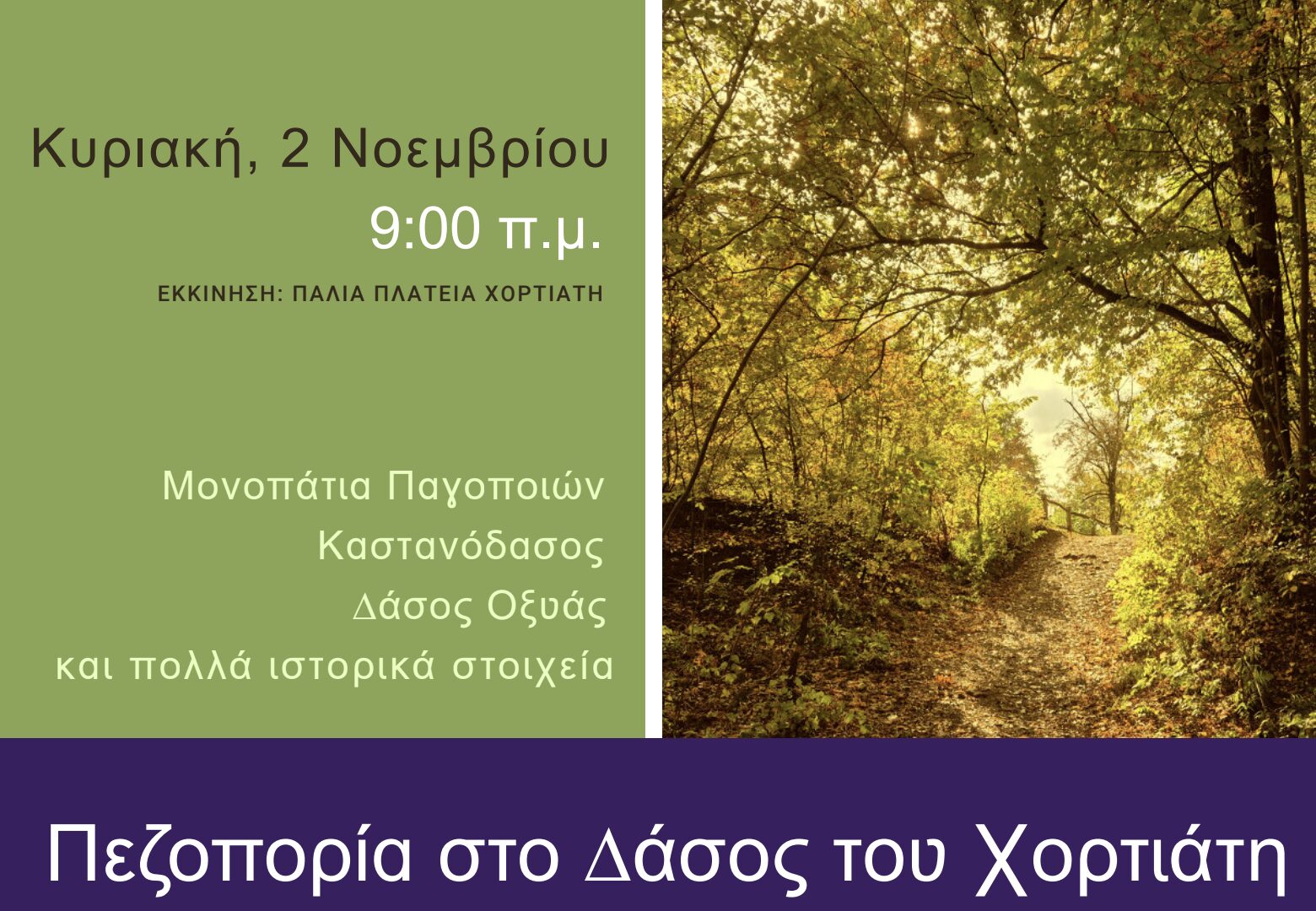 Εδώ και 30 χρόνια, η “Κίνηση Πολιτών Χορτιάτη”, ο Αθλητικός Σύλλογος Χορτιάτη, και η εφημερίδα “ΧΟΡΤΙΑΤΗΣ 570” διοργανώνουμε την πρώτη Κυριακή του Νοέμβρη την καθιερωμένη πλέον πεζοπορία για να γνωρίσουμε και να χαρούμε το πολυποικιλιακό, πανέμορφο, και ζωογόνο δάσος του Χορτιάτη, μόλις 20 χιλιόμετρα από το Λευκό Πύργο.
