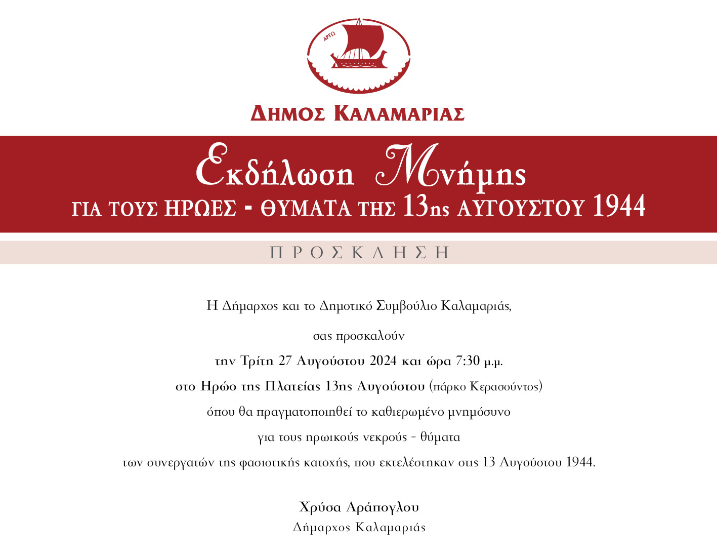 Εκδήλωση μνήμης για τους ήρωες-θύματα της 13ης Αυγούστου του 1944, όταν οι συνεργάτες των Γερμανών κατακτητών, το διαβόητο τάγμα του Δάγκουλα, συνέλαβαν 13 αθώους Καλαμαριώτες μέσα στα σπίτια τους και τους εκτέλεσαν στο σημείο που σήμερα βρίσκεται το πάρκο Κερασούντος, διοργανώνει αύριο Τρίτη 27 Αυγούστου, ο Δήμος Καλαμαριάς.