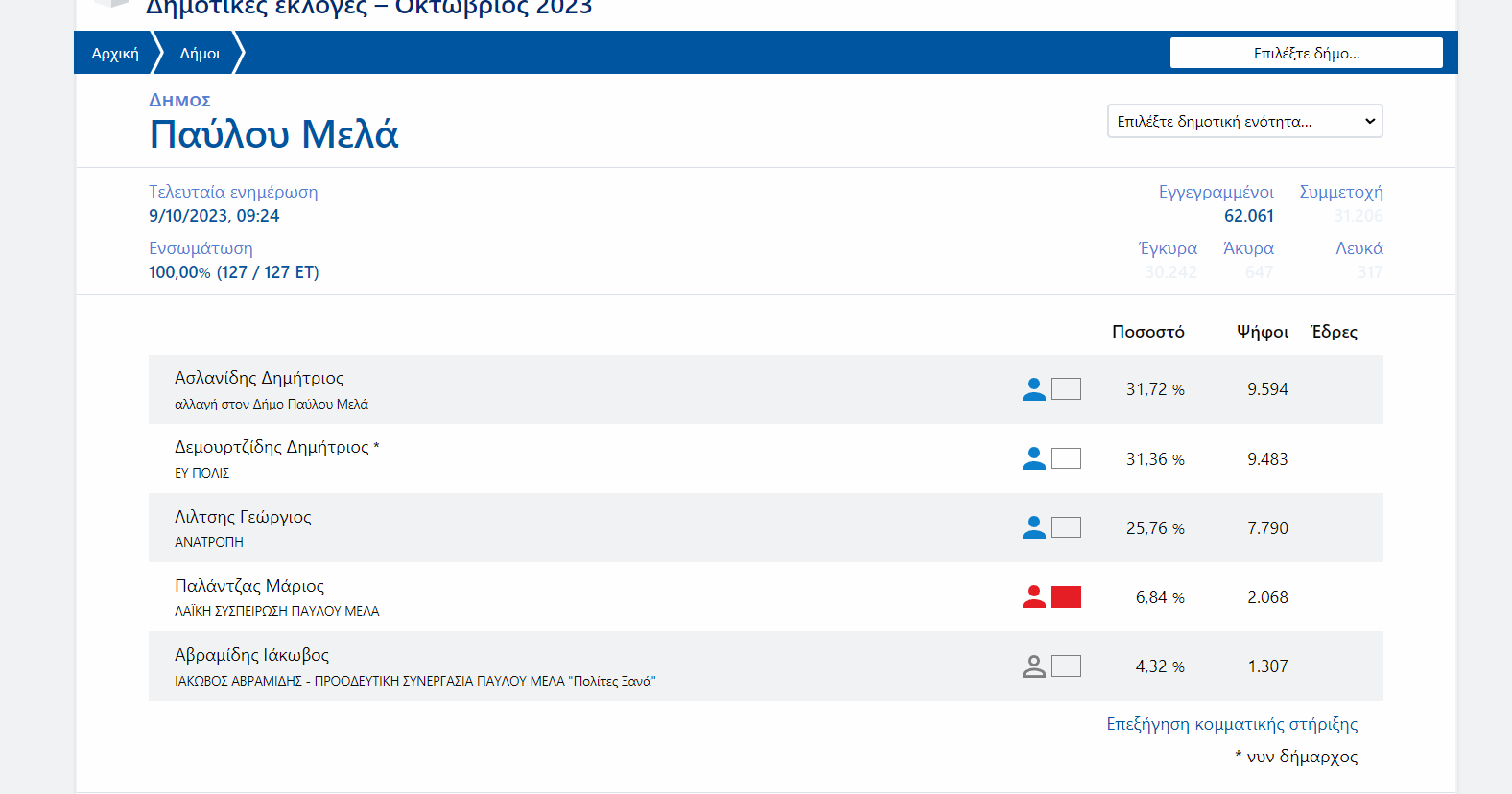 Στο δεύτερο γύρο θα κριθεί ο Δήμος Παύλου Μελά, με τη διαφορά μεταξύ Ασλανίδη – Δεμουρτζίδη να είναι ελάχιστη καθώς τους χωρίζουν μόλις 111 ψήφοι.